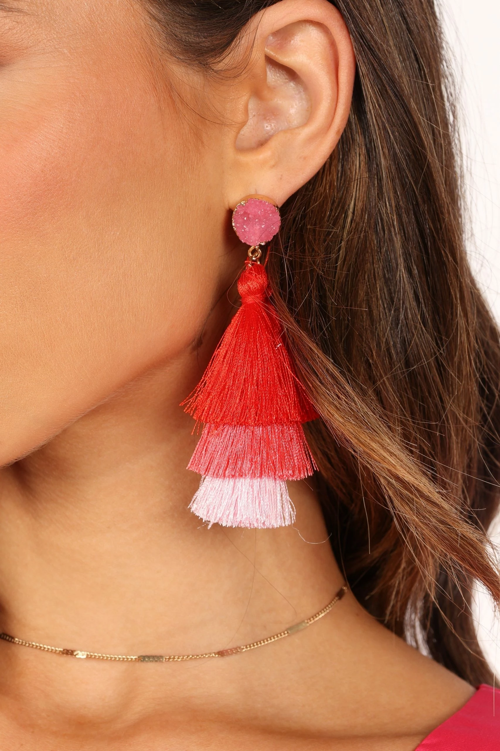 | DETAILS Treat yourself to these stunning, feminine pink tassel earrings – perfect for any special occasion. Their intricate details feature gold hardware and crystal stones that add just the right amount of sparkle. The tiered fringe detail delicately cascades towards the earlobe, creating an effortless look.