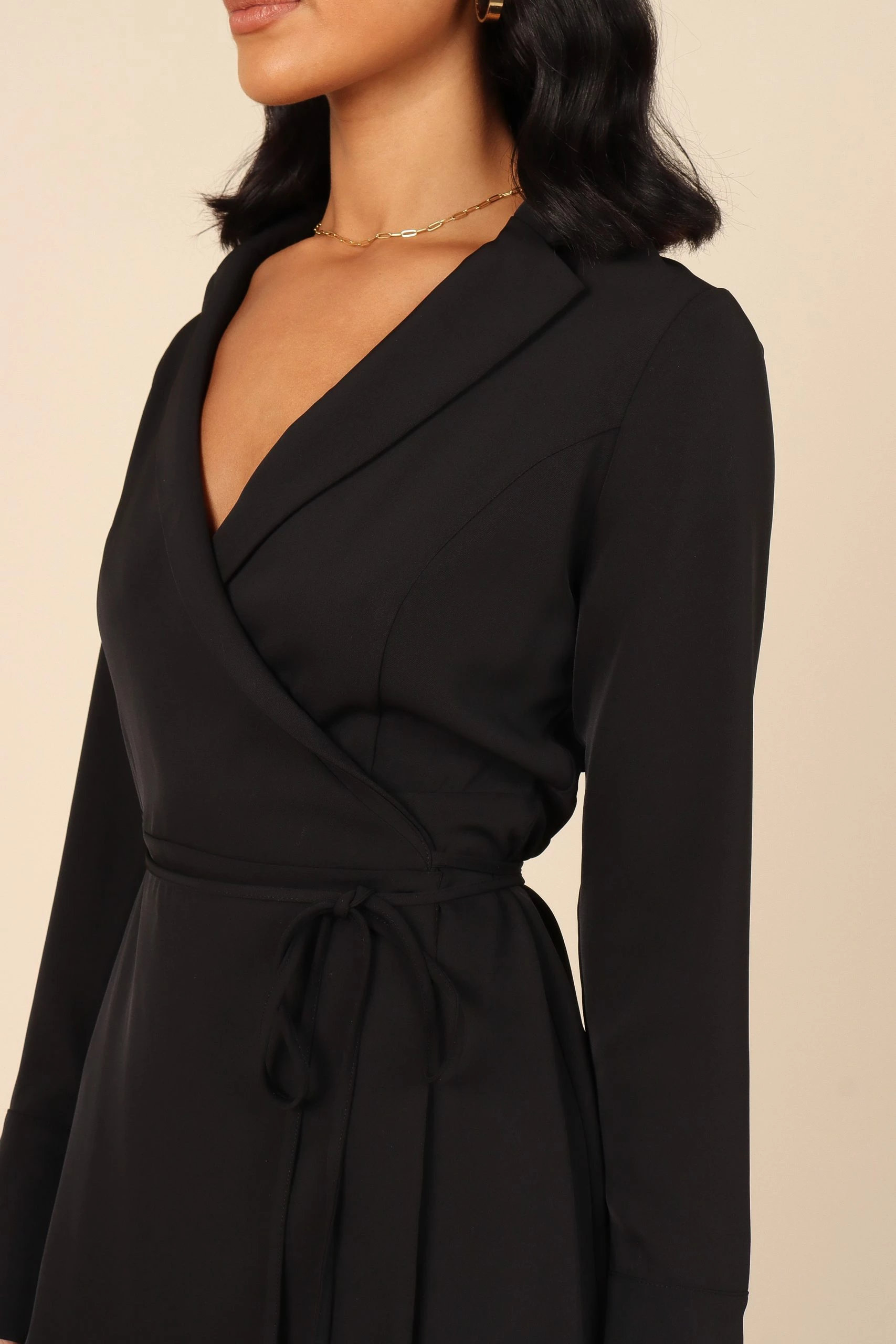 | DETAILS The blazer style dress is the perfect way to look flirty and elegant at the same time! This super chic dress features a collared v neckline with long sleeves that fasten closed with buttons at the cuffs.