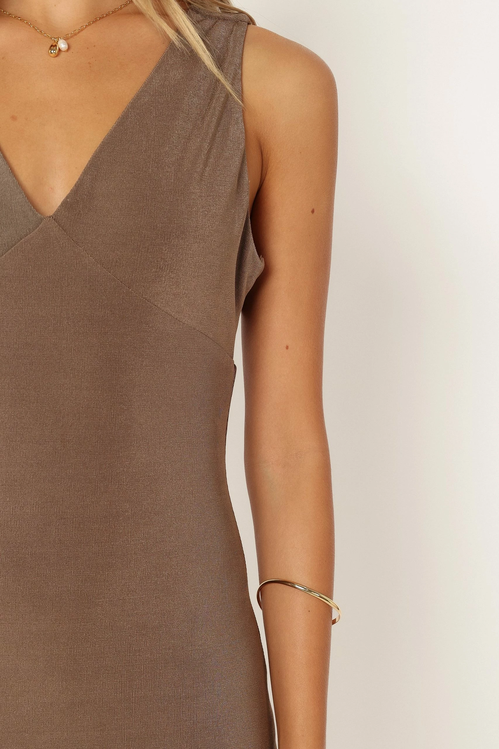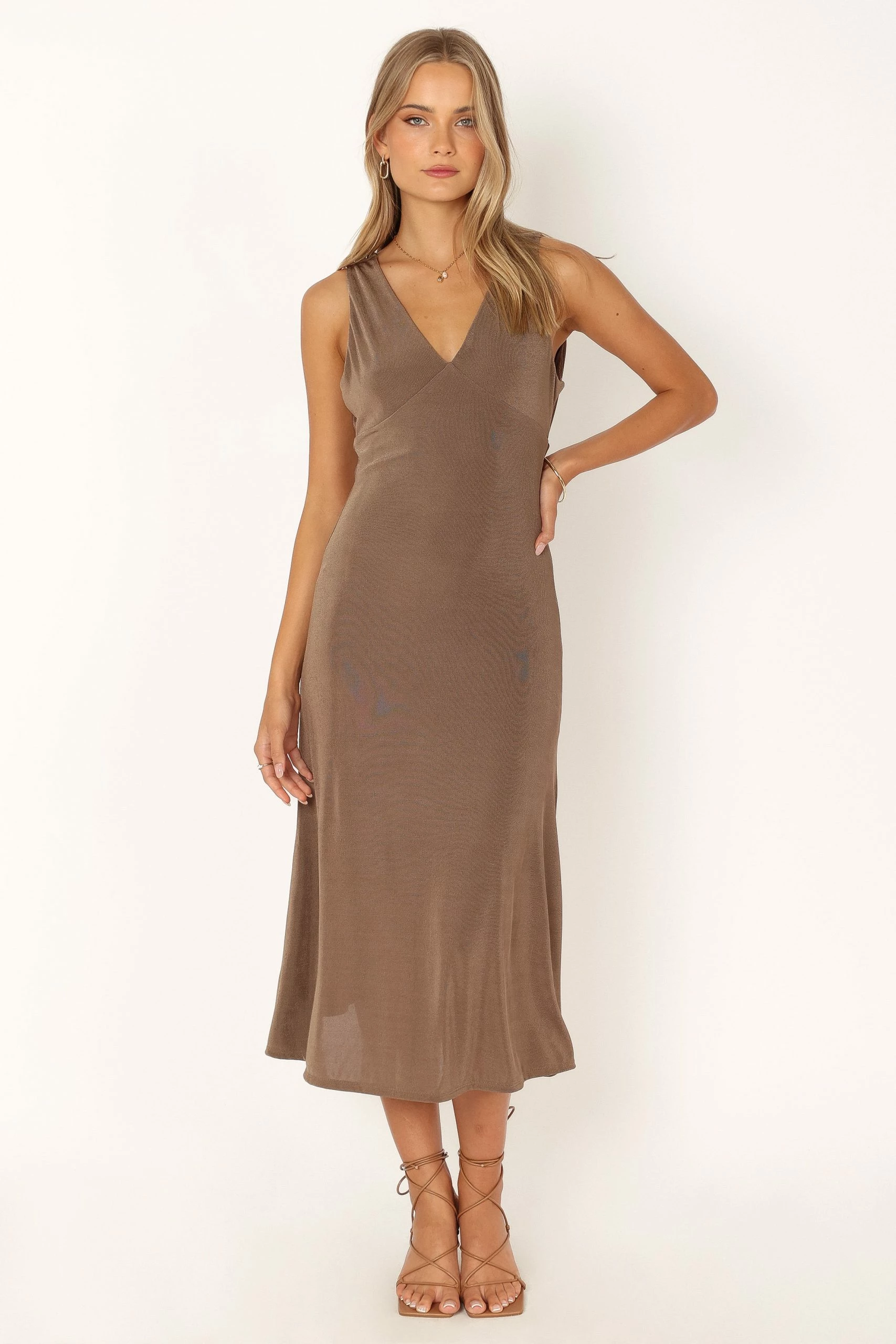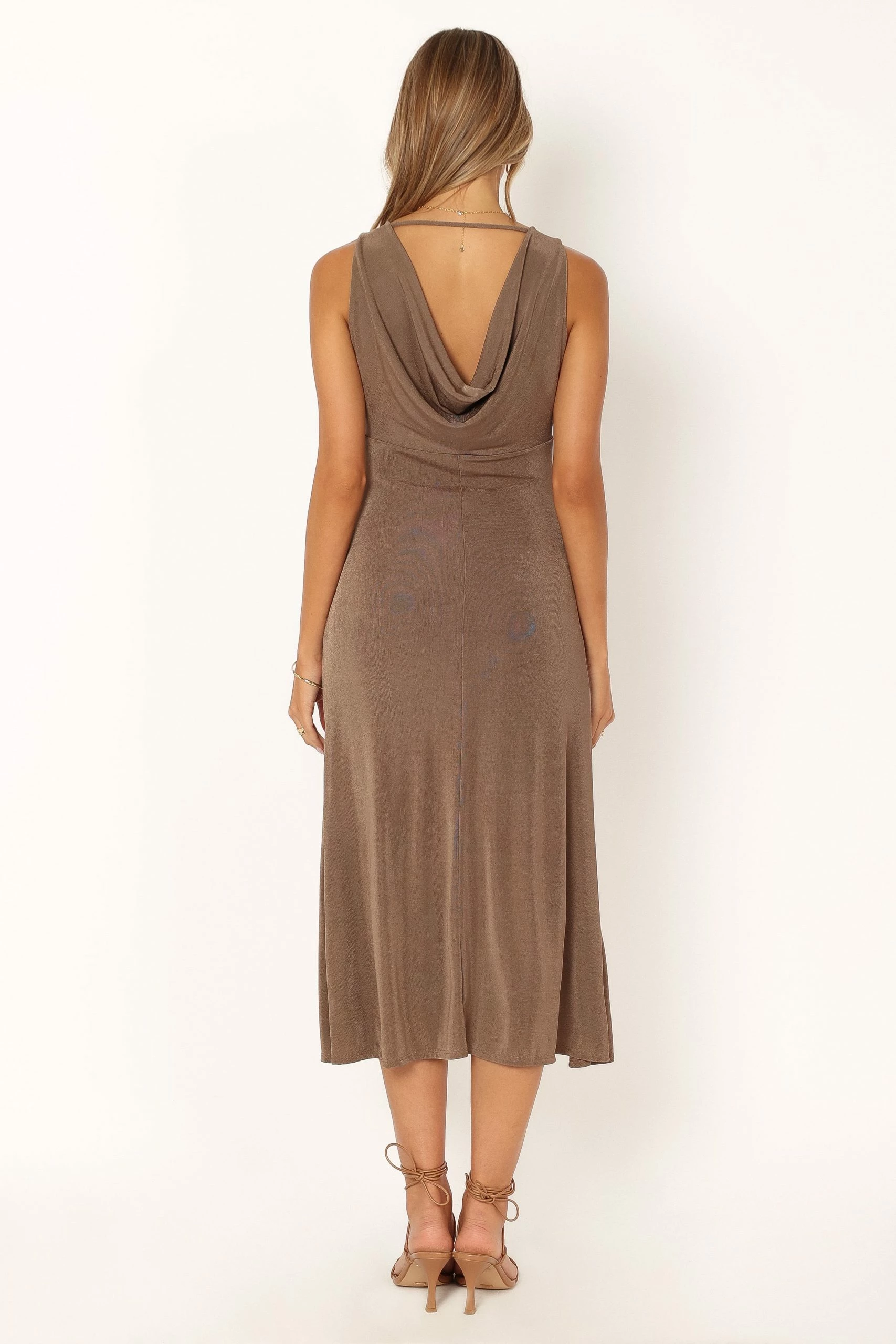 | DETAILS This midi dress is the perfect choice for any special event. With a length that falls below the knees, you can be sure to make an elegant statement. The v-neckline and non adjustable straps provide classic sophistication and the cowl neck back along with back strap detail adds just enough edge to make this one stand out from the crowd.