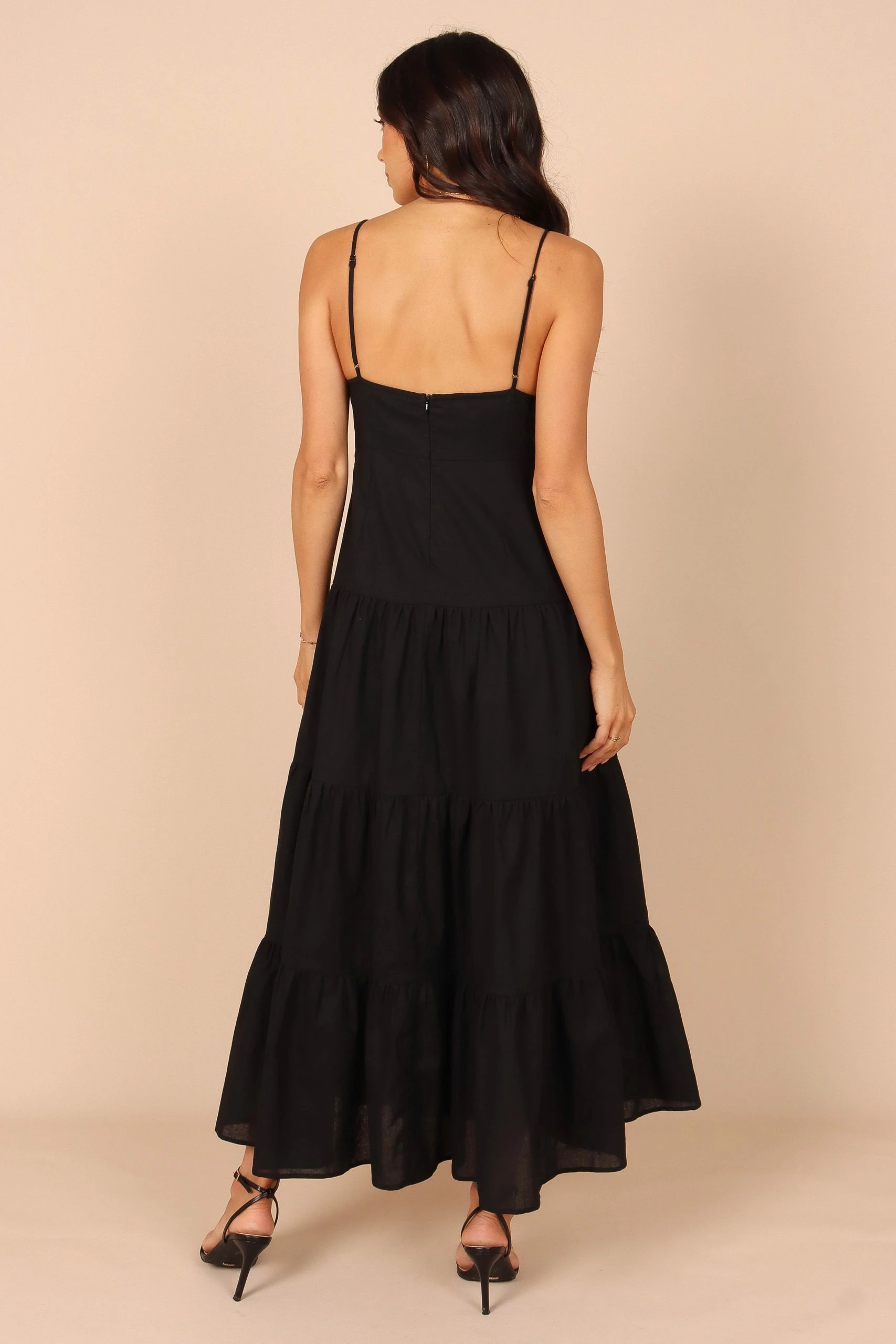| DETAILS Be the star of the show in this gorgeous maxi dress. Its v neckline and thin adjustable straps create a timeless silhouette, while its front cut out detail on bust adds an extra touch of elegance. The beautiful non functional buttons down the front also add to its charm.