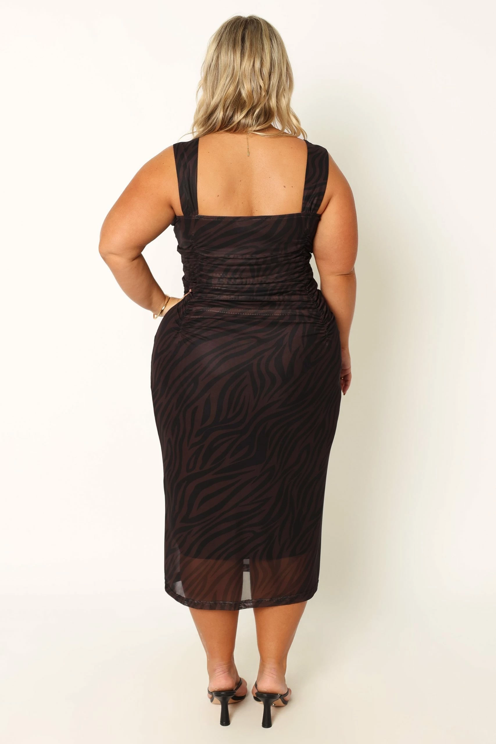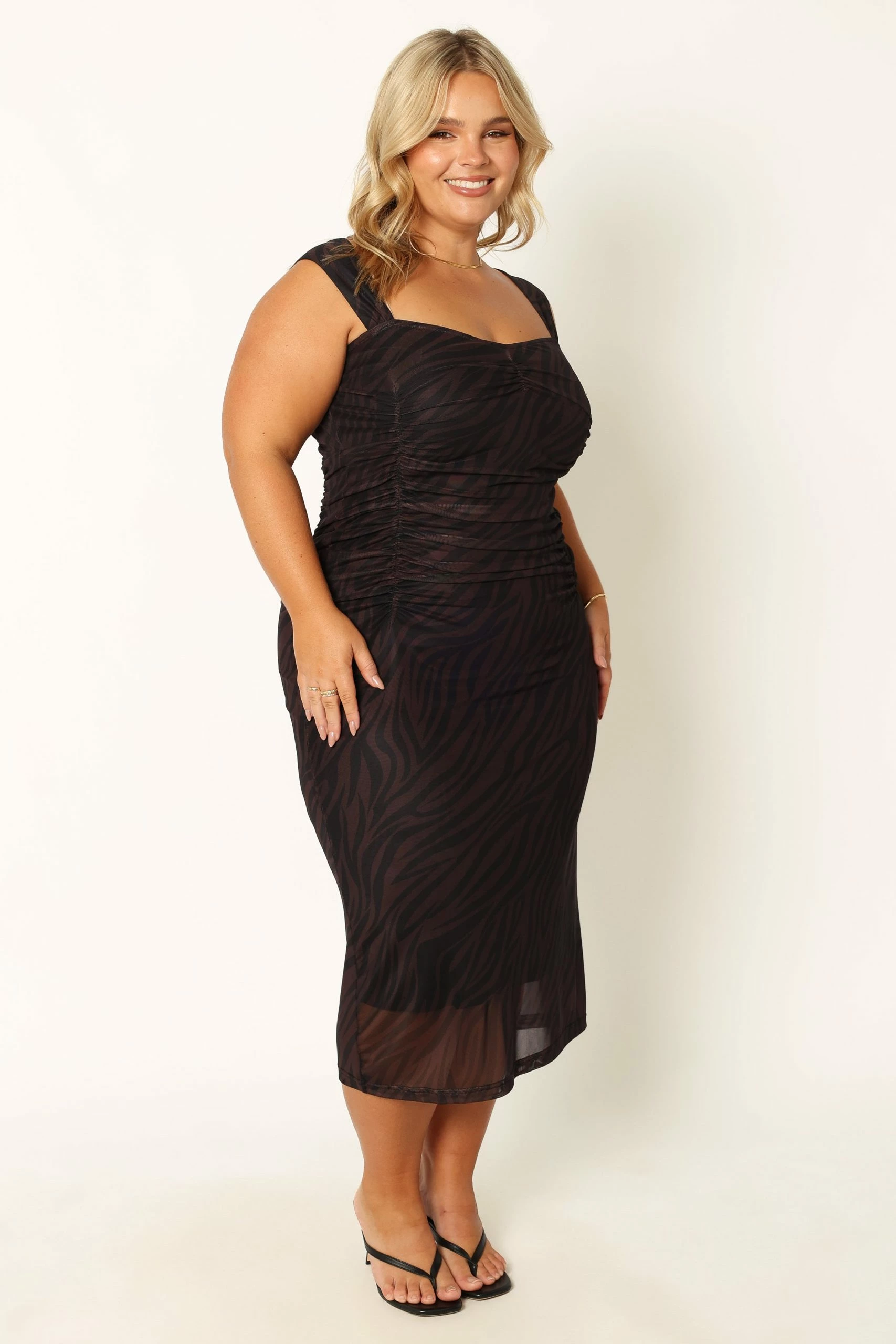 | DETAILS This gorgeous midi dress is perfect for any special occasion. Featuring a sweetheart neckline, non-adjustable straps and a bodycon fit that flatters your figure, this dress stands out with its gathered ruching detail on the body and soft mesh overlay.