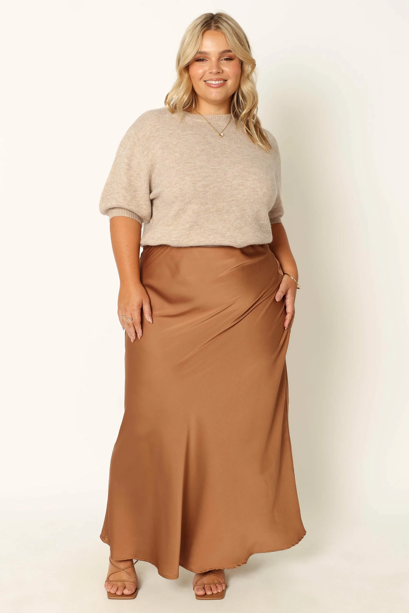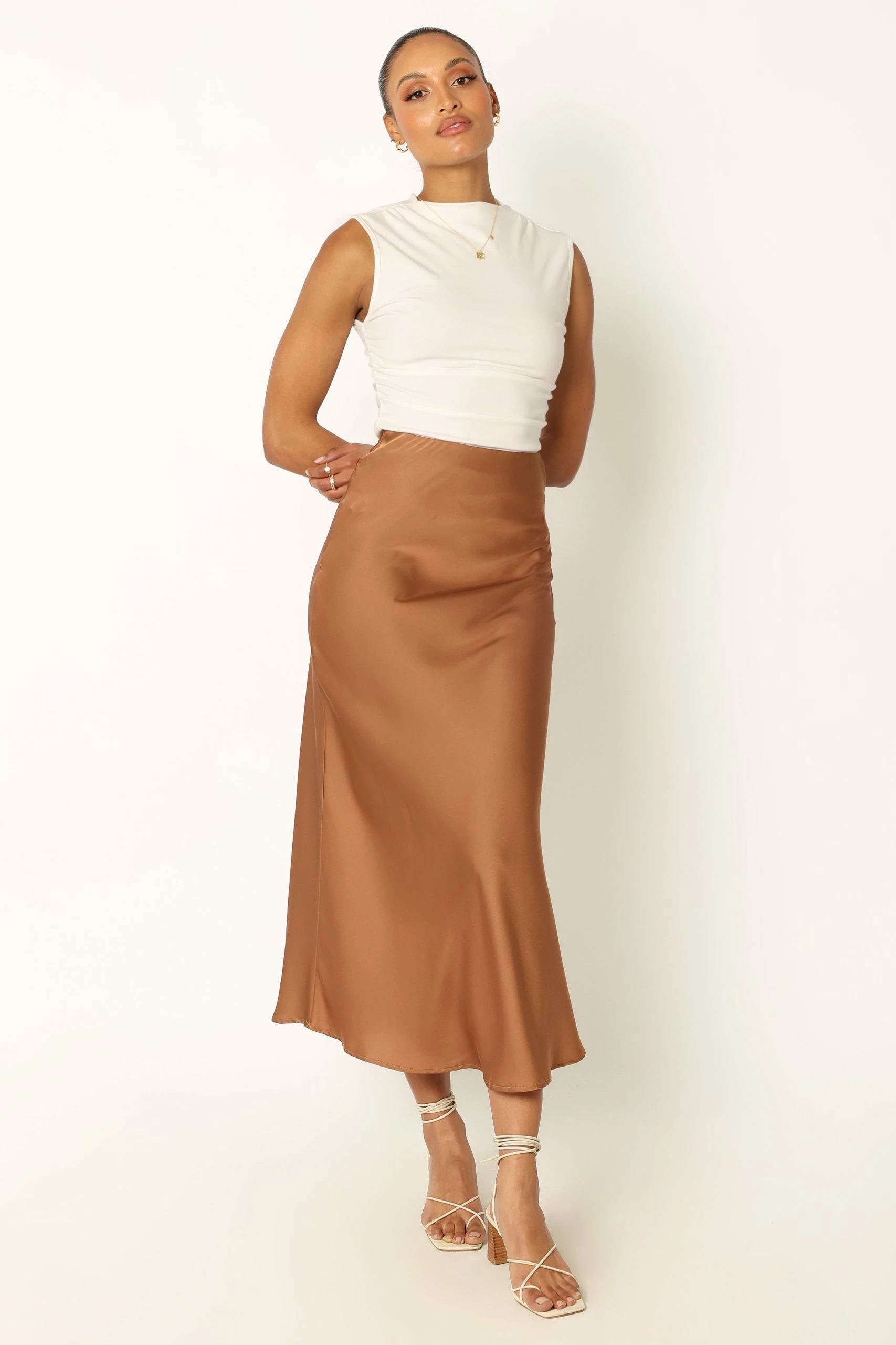 | DETAILS This midi skirt will be your go-to for everyday style. Crafted from a soft satin fabric, it features an elasticised waistband and a pull on design for fuss-free dressing. The bronze color is a timeless classic that you’ll reach for again and again.