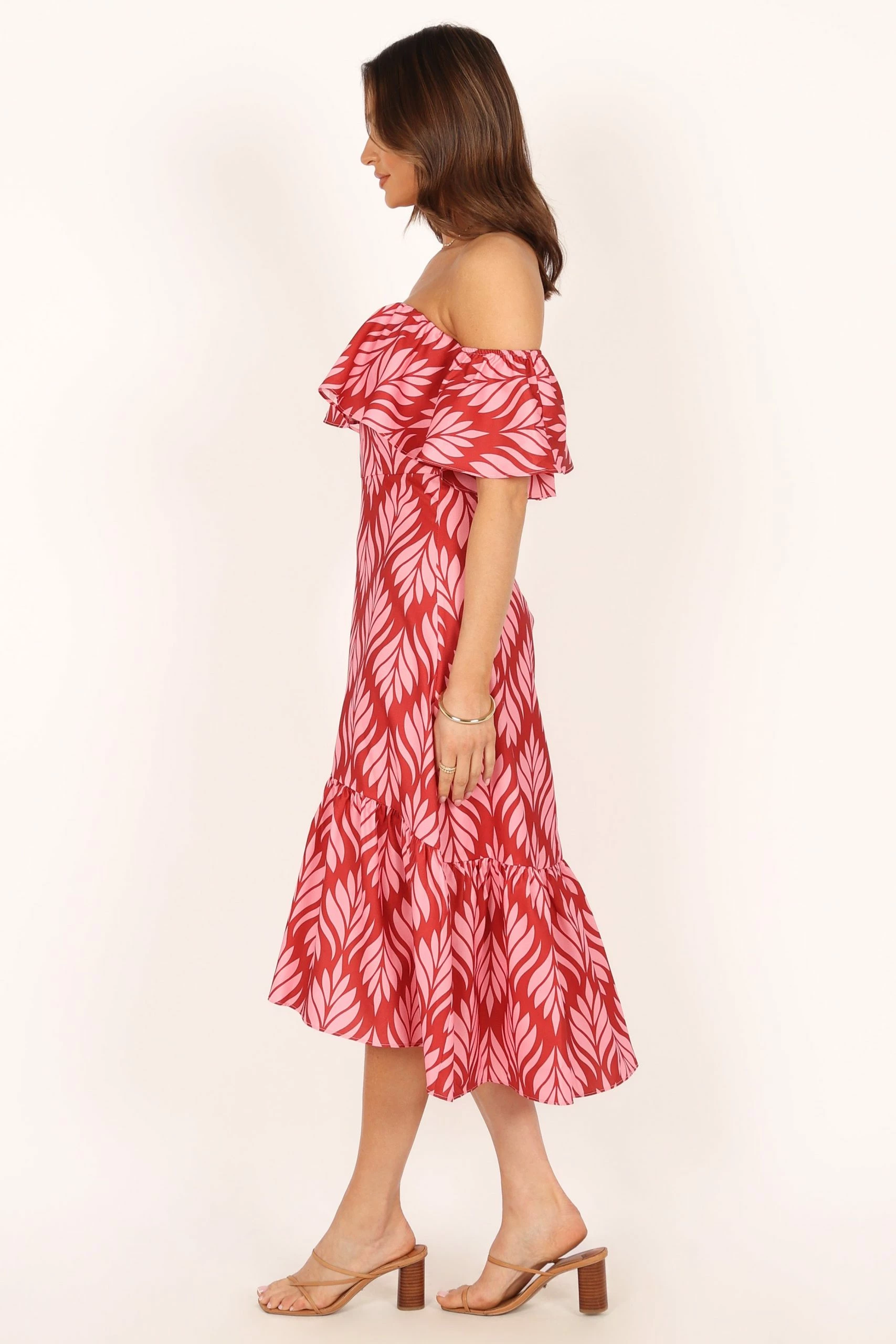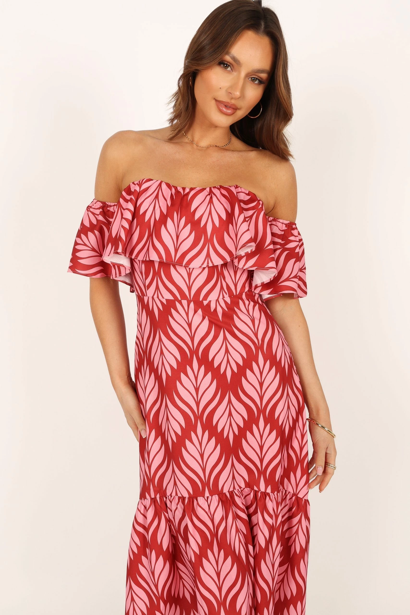 | DETAILS Introducing our stunning strapless red palm print dress, designed to turn heads and make you the show-stopper at any summer event. This midi-length dress features a chic straight neckline and elasticised sleeves, effortlessly combining comfort with style.