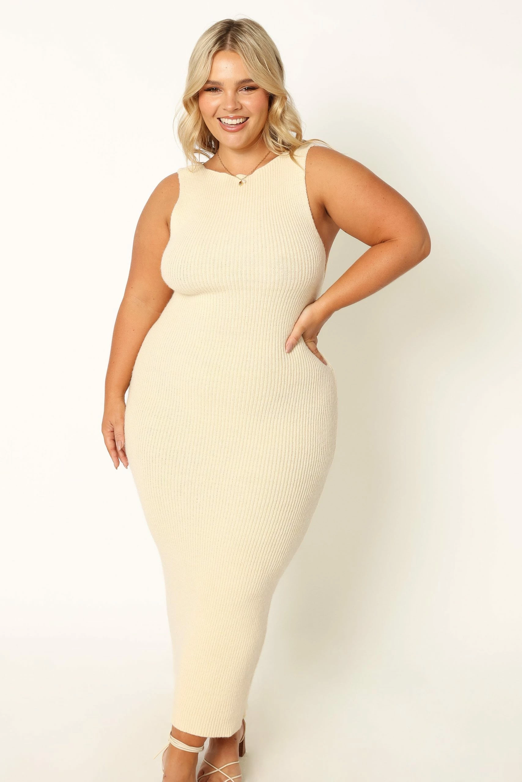 | DETAILS Welcome to the perfect midi dress! This beige knitted dress has a high round neckline for a smart sophisticated look. Its back cut out with twist feature adds an edgy touch, giving you the best of both worlds.