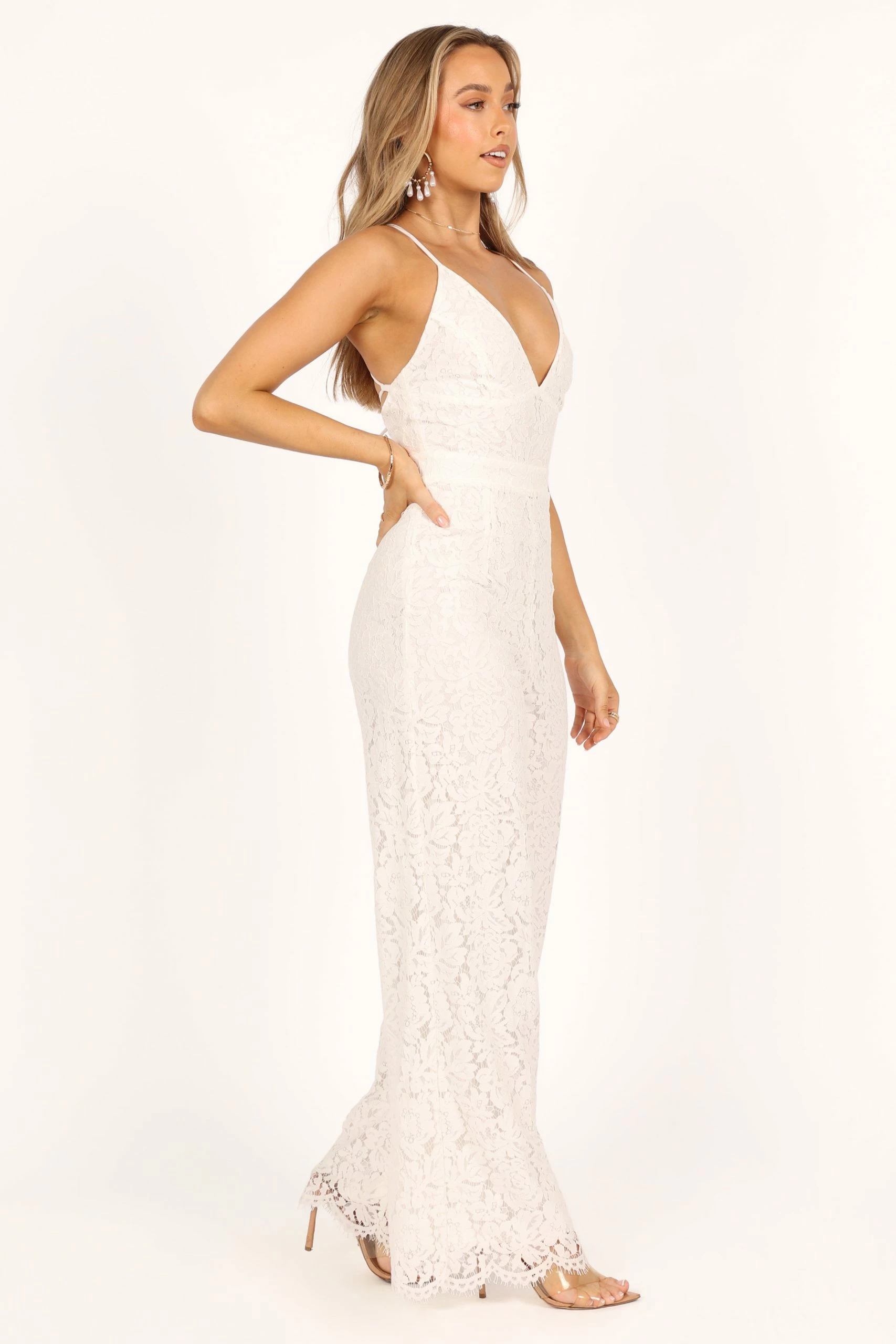 | DETAILS If you’re looking for an effortlessly glamorous jumpsuit, this lace number is the one for you! The flattering v neckline, tie close shoulder straps and back cross over detail give it a truly special touch.