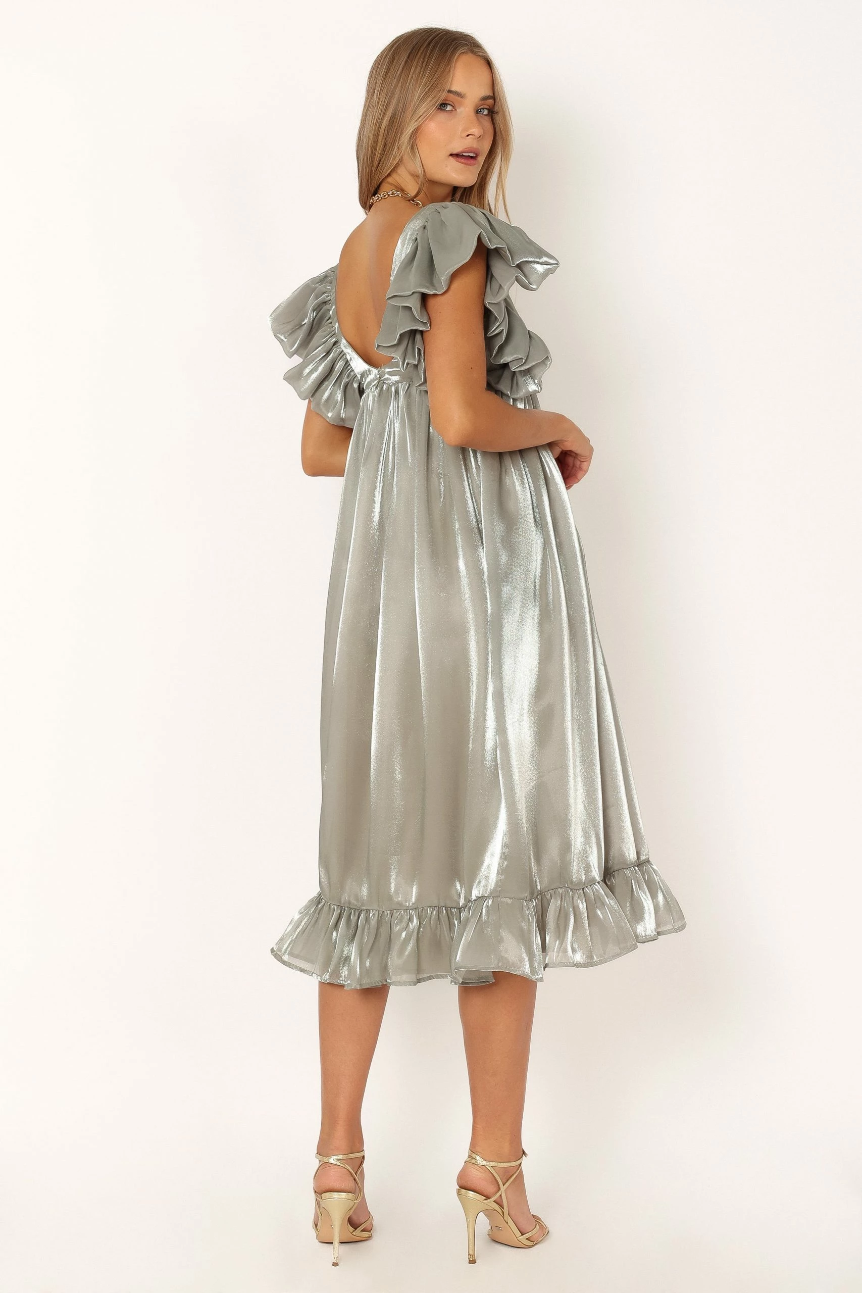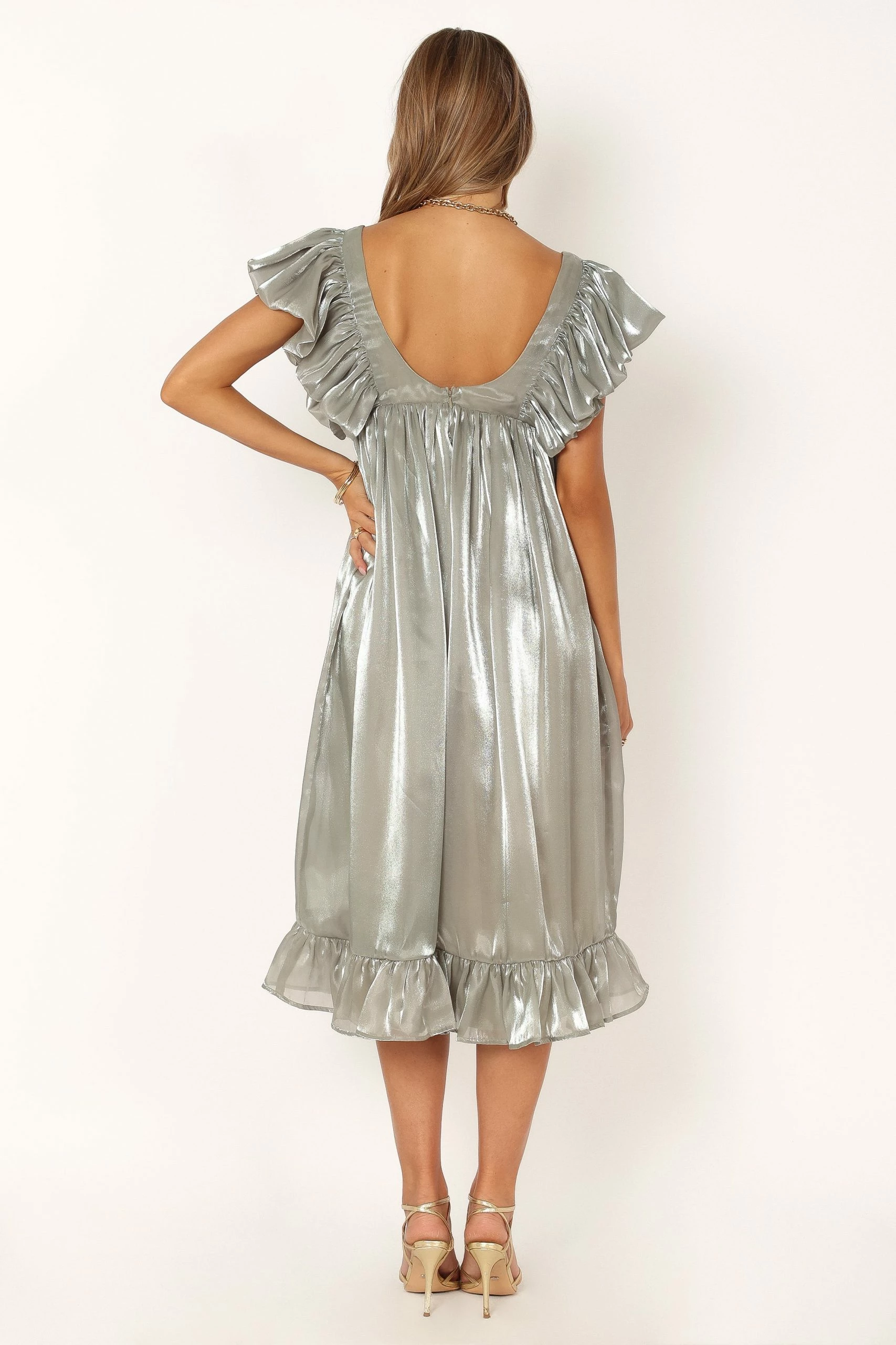 | DETAILS Introducing the perfect piece for any special occasion! This maxi dress is made from a luxurious satin sheen material and features an elegant V-neckline, short ruffle sleeves, and a ruffle hem. The back has an invisible zip fastening with hook and eye clasp, as well as a subtle back split that makes it the ideal eventwear.
