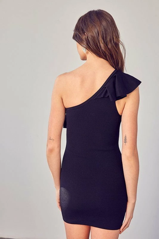 | DETAILS Are you ready to turn heads this season? Look no further than this one shoulder style knit dress! The mini length and asymmetric neckline with ruffle detail will have all eyes on you, while the sleeveless design and bodycon fit show off your curves.
