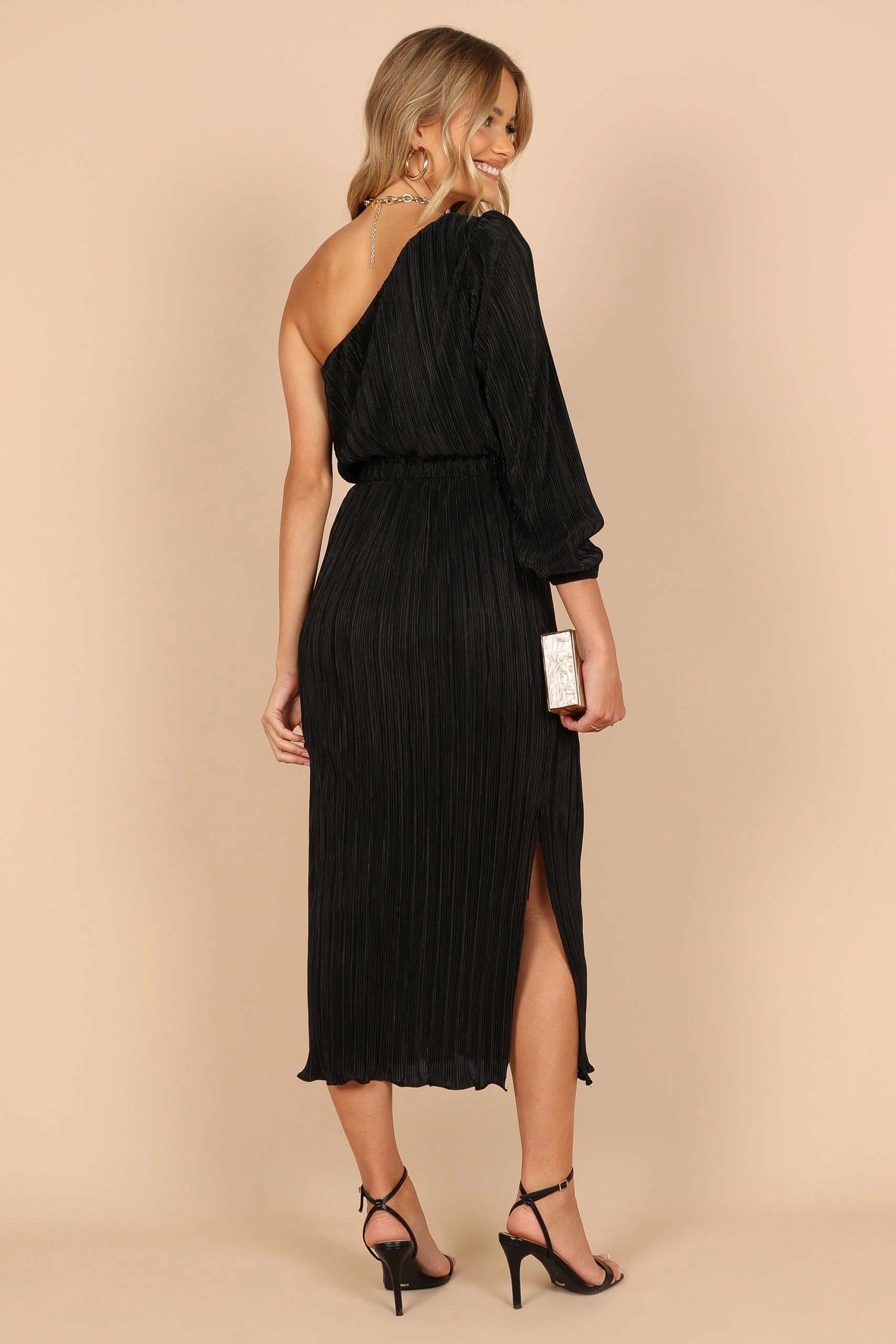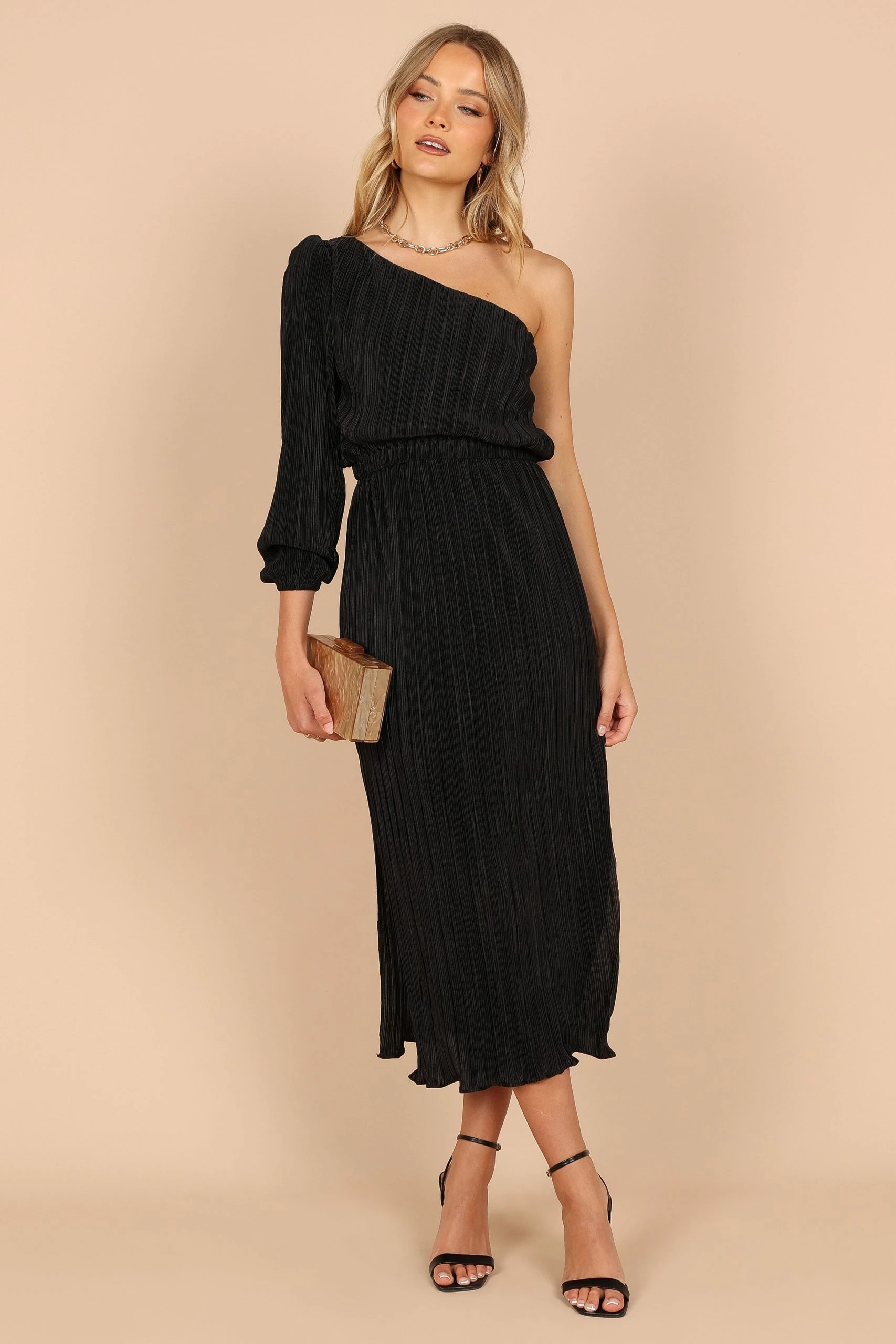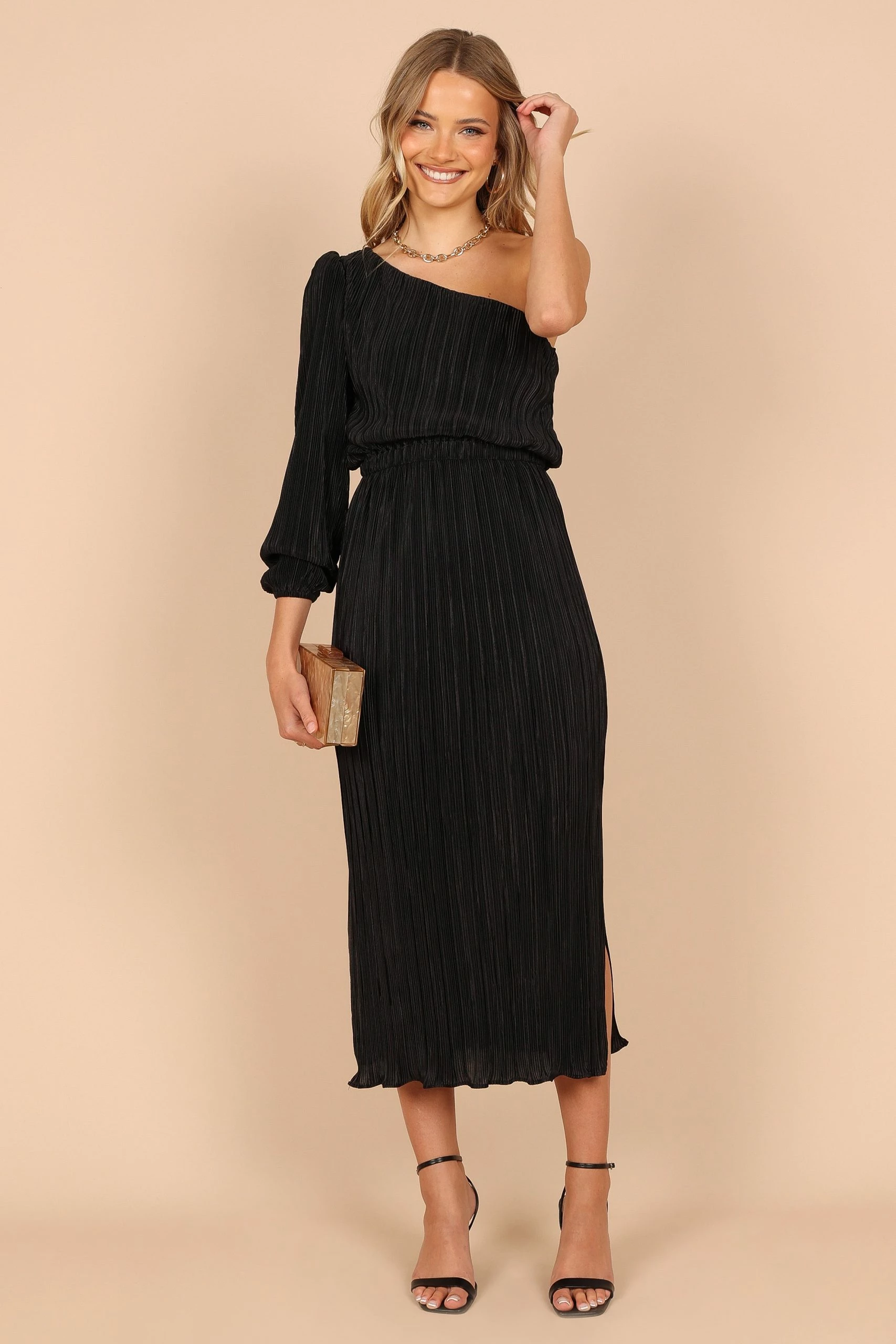 | DETAILS Choose a one shoulder style dress for the perfect balance of flirty and elegant. This midi length dress has an asymmetric neckline that’s sure to make a statement, while long sleeve with elasticised cuff adds drama to your silhouette. If you are in between sizes, we suggest selecting the size down due to the relaxed fit of this dress.