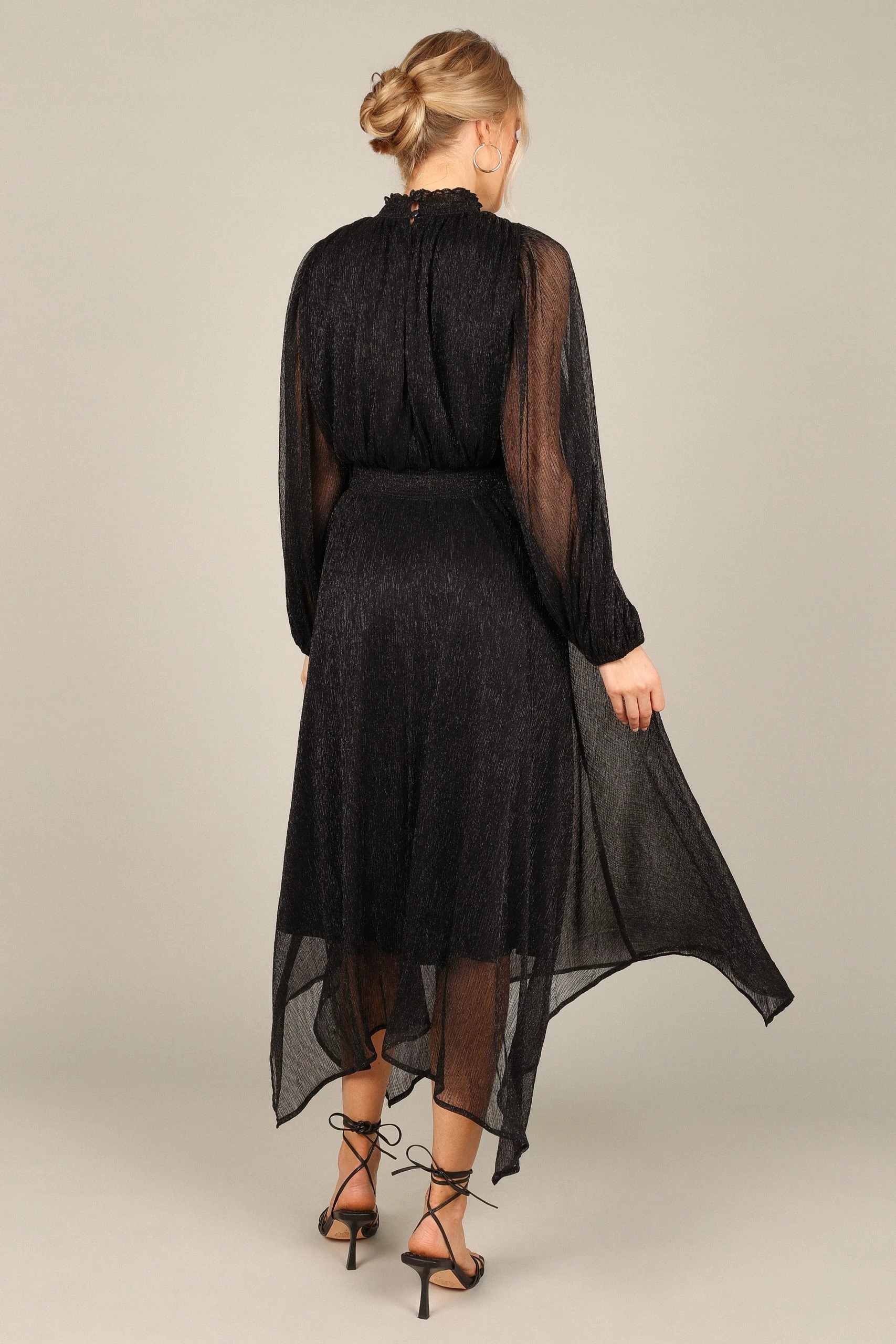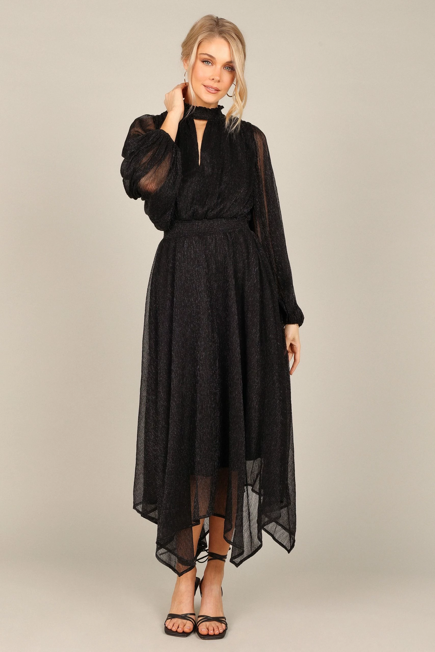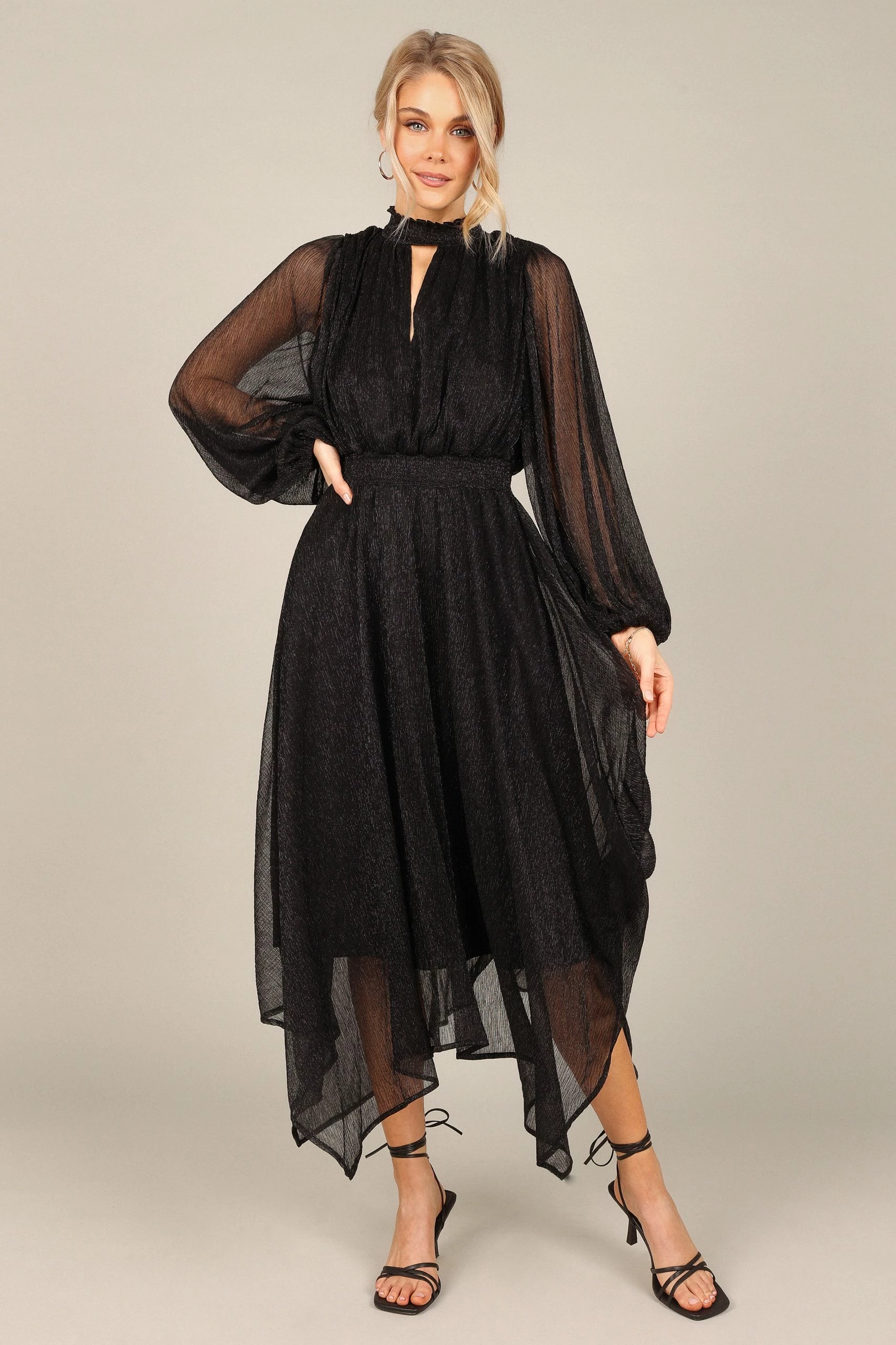 | DETAILS This midi dress is the perfect wardrobe staple for any party. With a classic high round shirred neckline, long sleeves with elasticised cuffs, and an eye-catching front cut out on the bust, this midi length dress will have you looking effortlessly stylish at every event.
