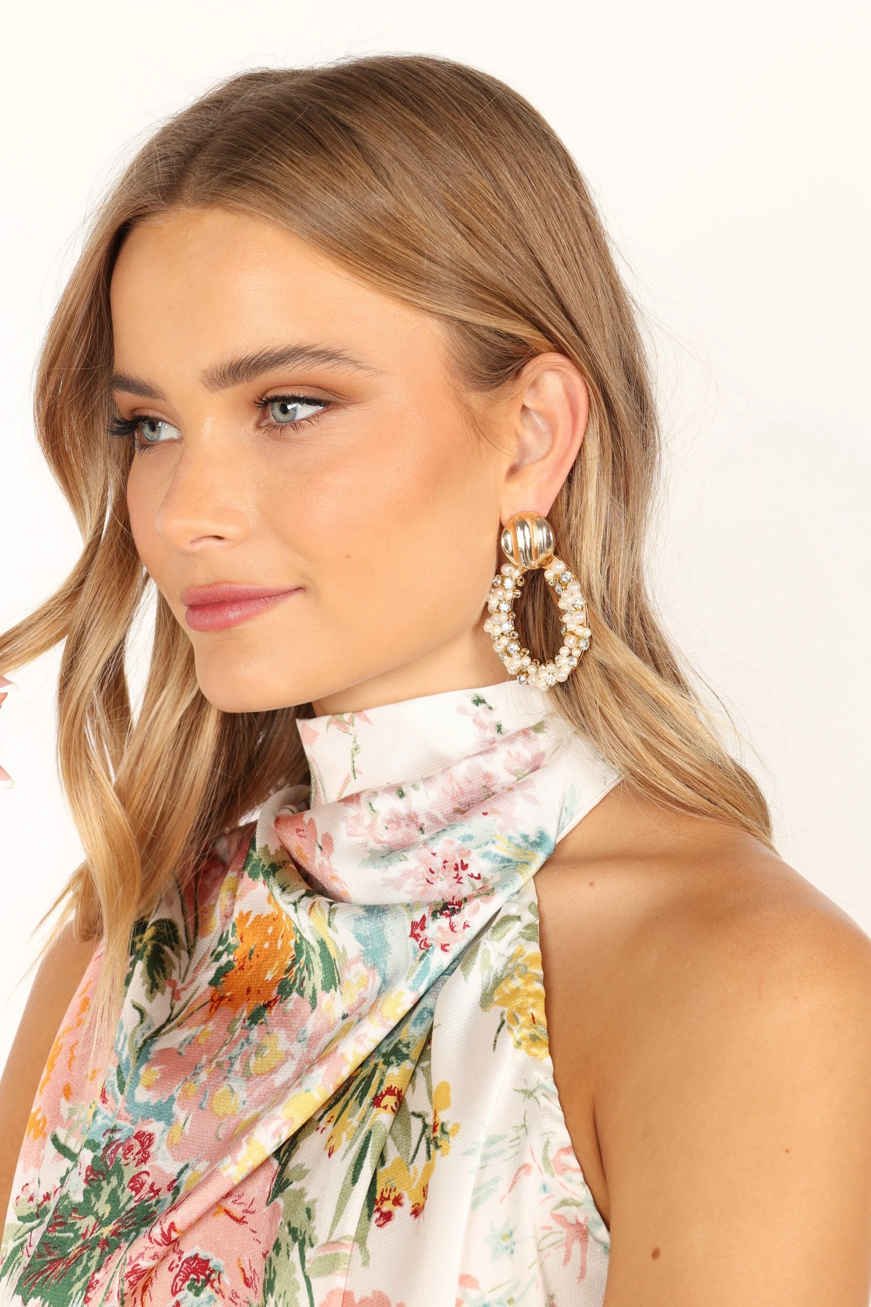 | DETAILS Elevate your look with these stunning drop style earrings. Featuring an oval design with pearl crystal embellishment, they are crafted from gold plated metal and fasten with a stud back closure.