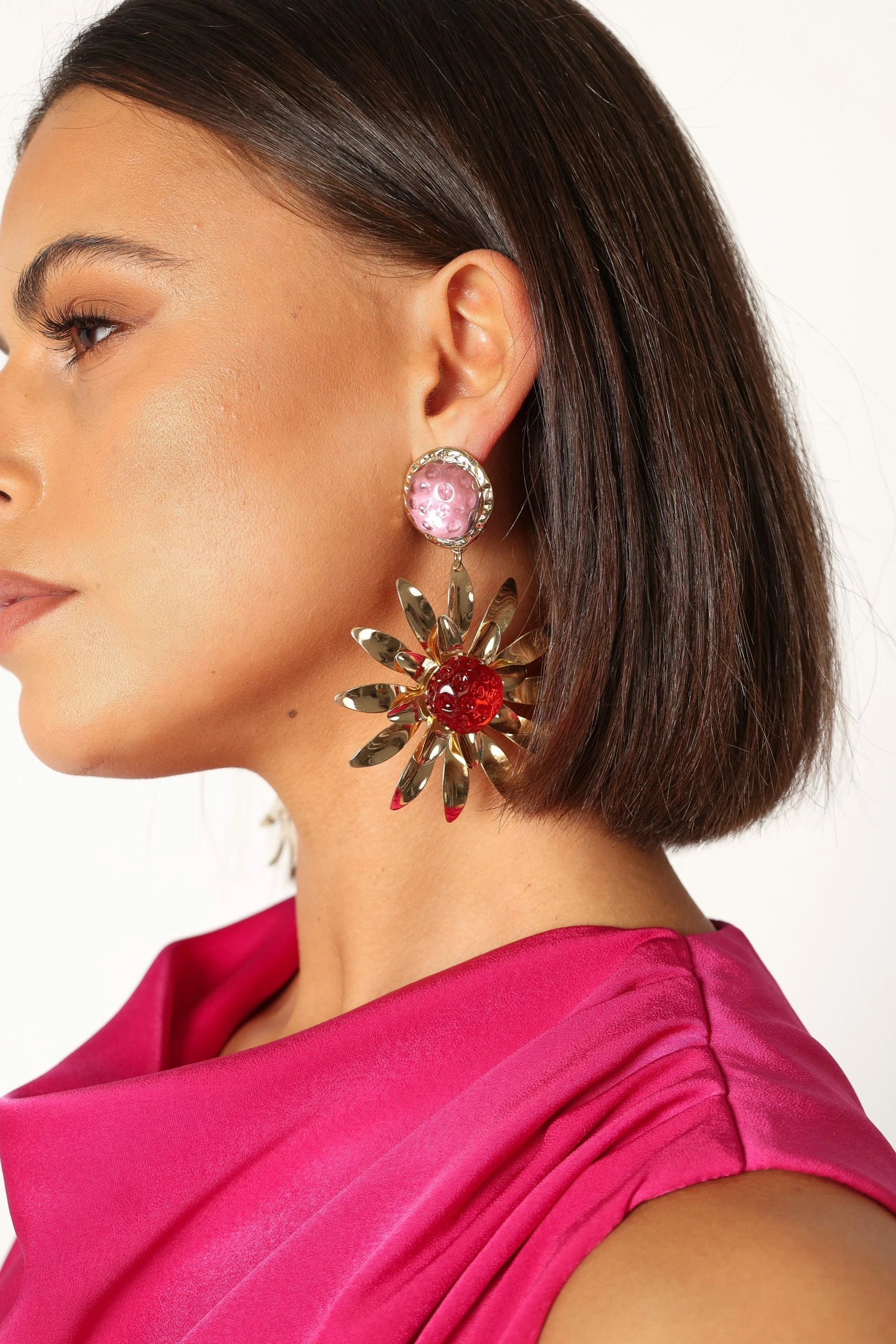 | DETAILS These stunning earrings will add a touch of class to your outfit. They feature a drop style floral design, gold hardware and a contrasting multi gem detail for that extra bit of sparkle.