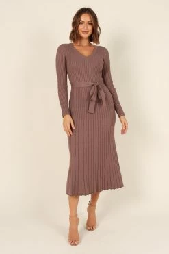 | DETAILS Look sophisticated and feel fabulous in this midi length knit dress. The v-neckline and long sleeves give it a classic look, while the detachable waist tie with belt loops adds an extra touch of elegance. Crafted from stretch ribbed knit, this dress features a flared A-line skirt design for a flattering fit.