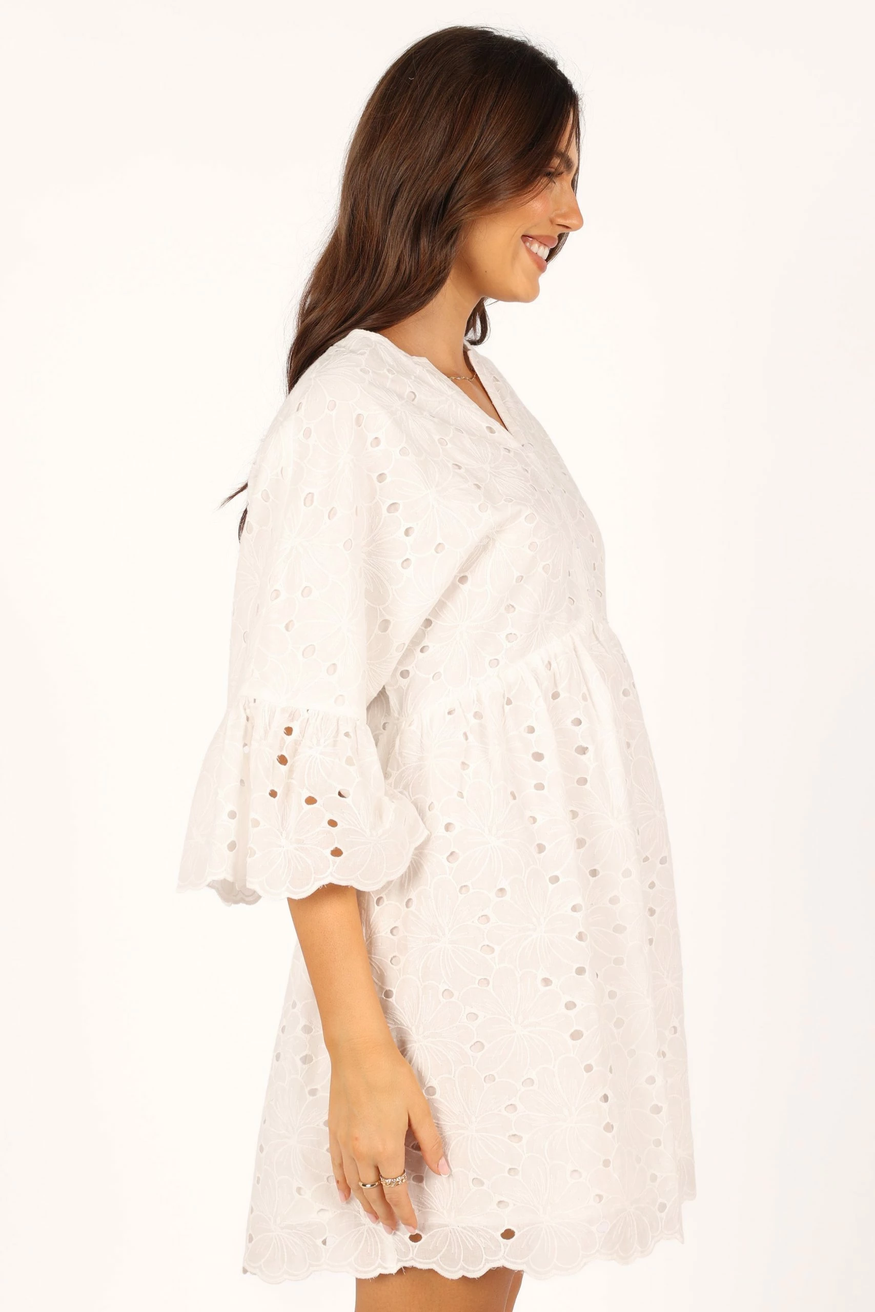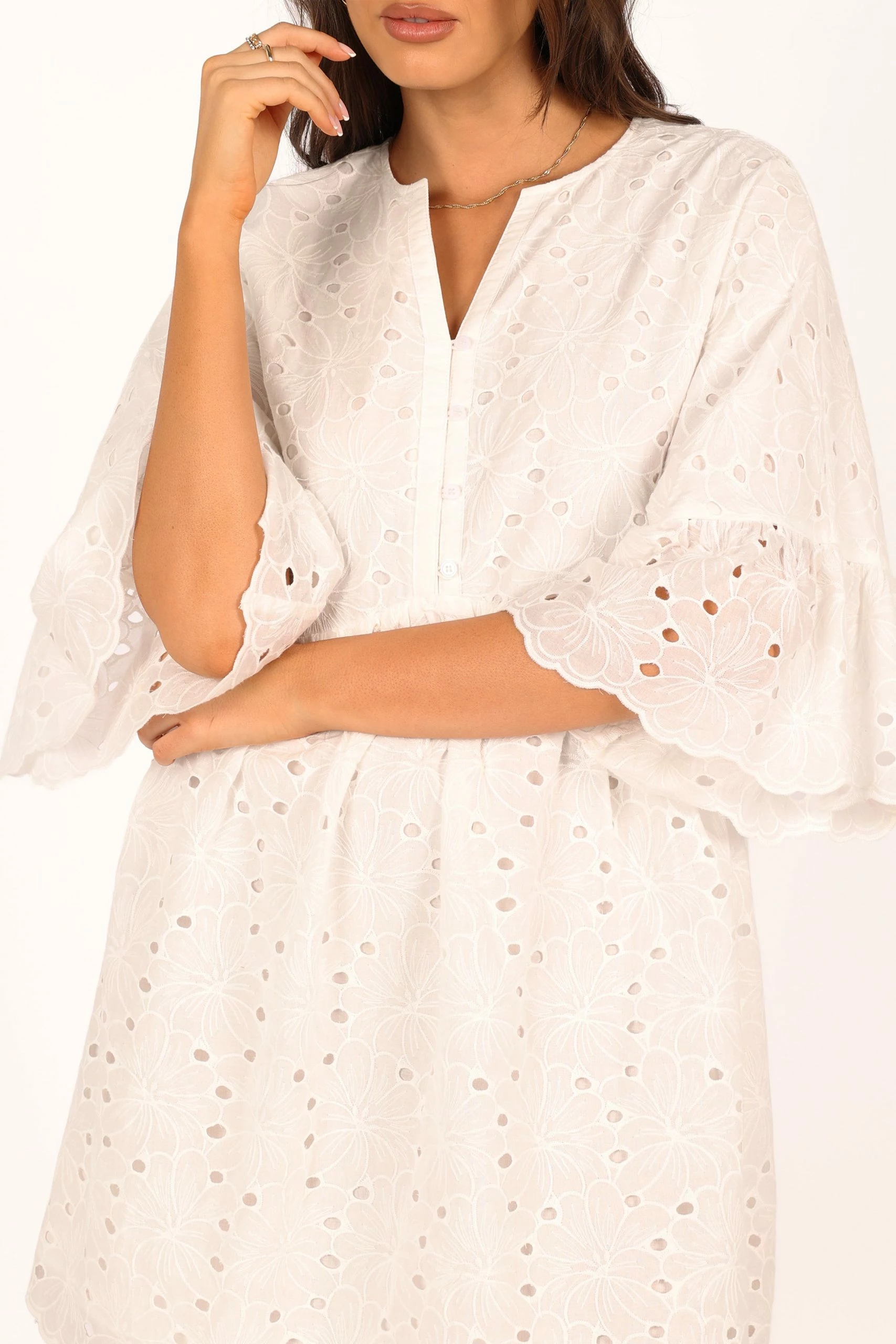 | DETAILS This beautiful mini dress is an ideal choice for your next summer soiree. Featuring a classic v neckline with subtle button down front, mid length sleeves with flutter sleeve detailing and an a line skirt, this piece is sure to make you stand out from the crowd!