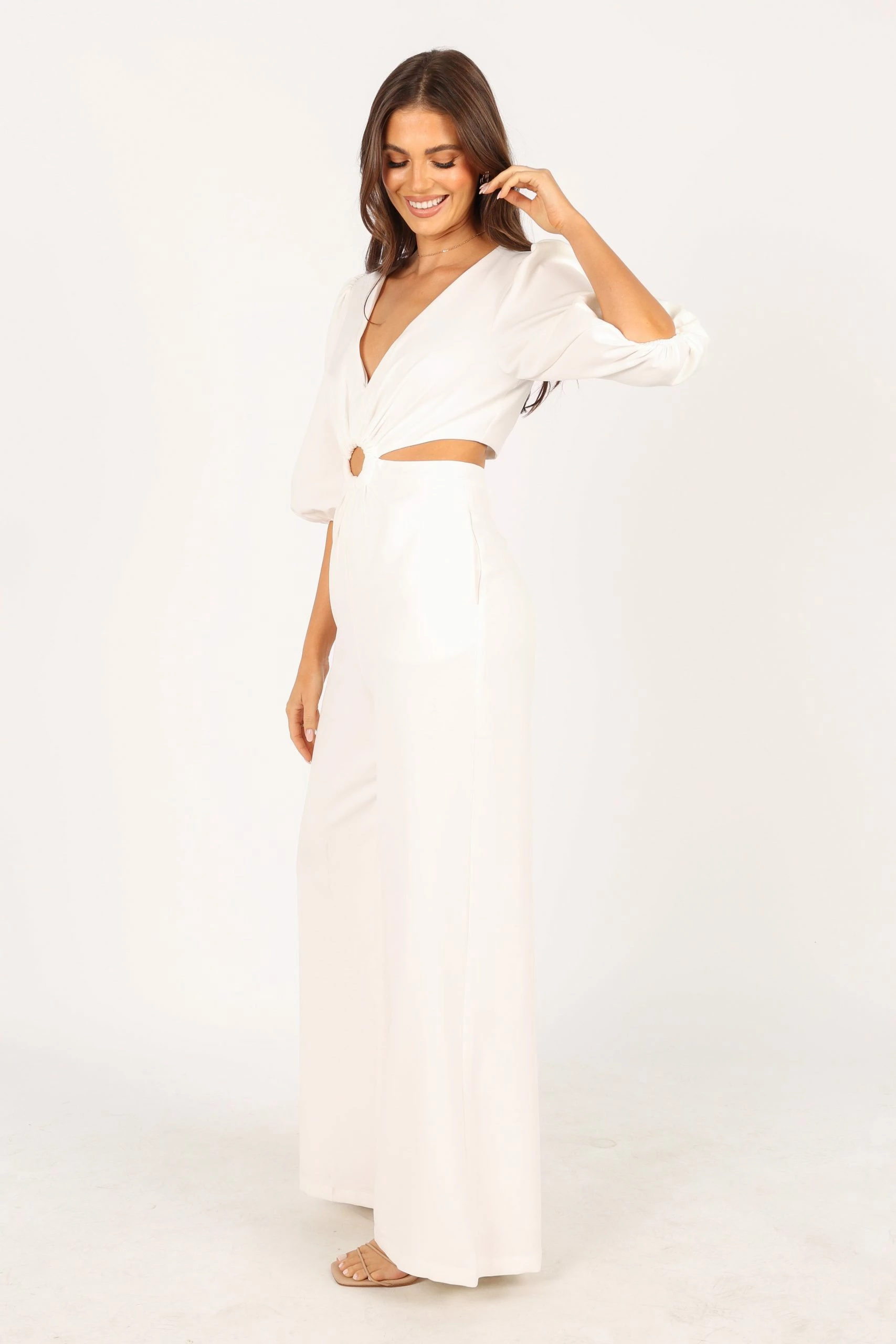 | DETAILS This fun and feminine jumpsuit features a unique back and side cut out feature that is sure to turn heads. The front ring detail adds an extra touch of glamor, while the wide leg style pants flatter any figure.