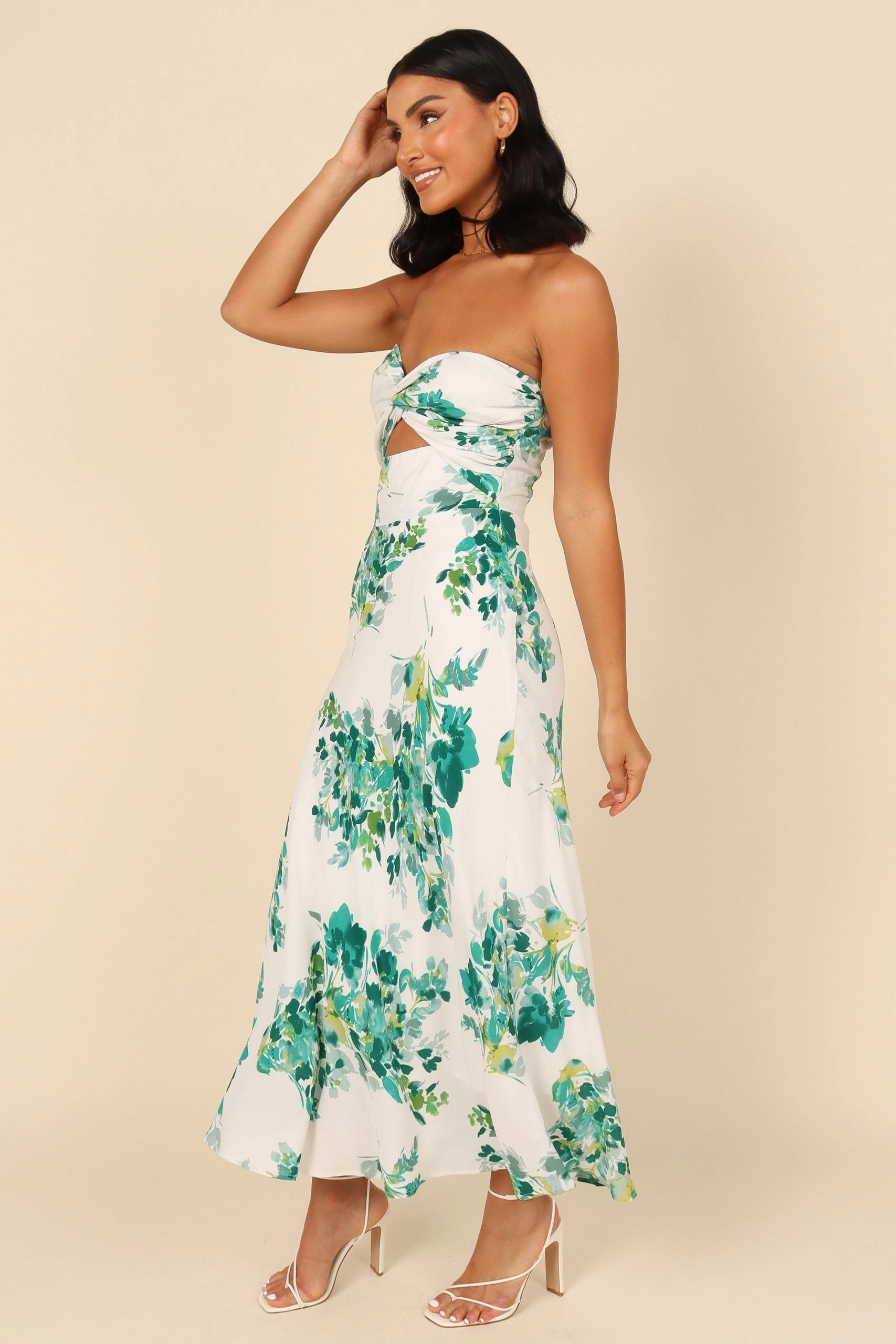 | DETAILS Welcome Summer in style with this midi dress! The strapless design will flatter any figure, and the sweetheart neckline adds a touch of femininity. Turn heads at any party with the front twist feature and cut out detail under the bust.