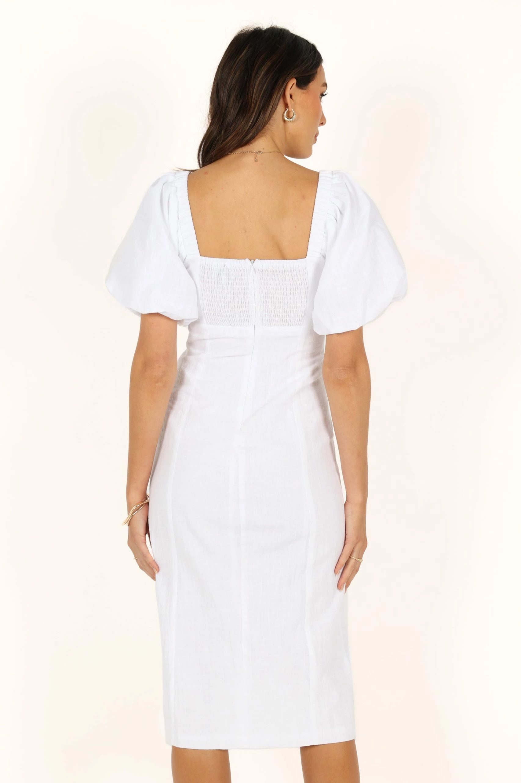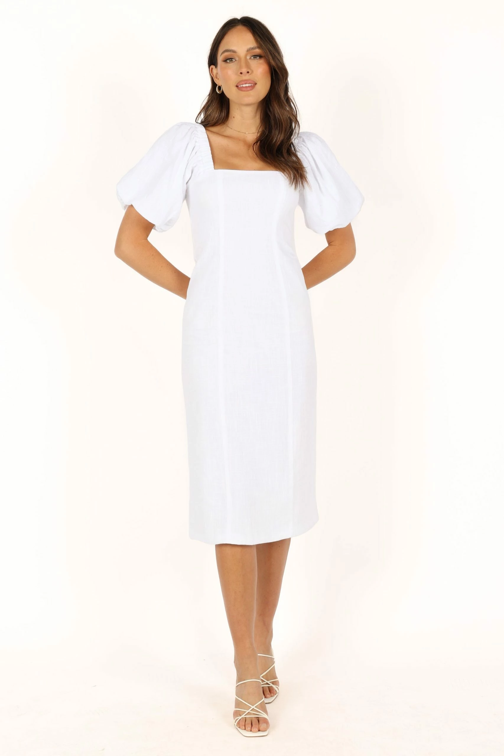 | DETAILS Look lovely in this midi length dress! Featuring a beautiful square neckline, short sleeves with elasticised cuffs for maximum comfort and a back invisible zip for easy wear. Its shirred panel at the back creates an incredibly flattering silhouette that will make you look and feel amazing.