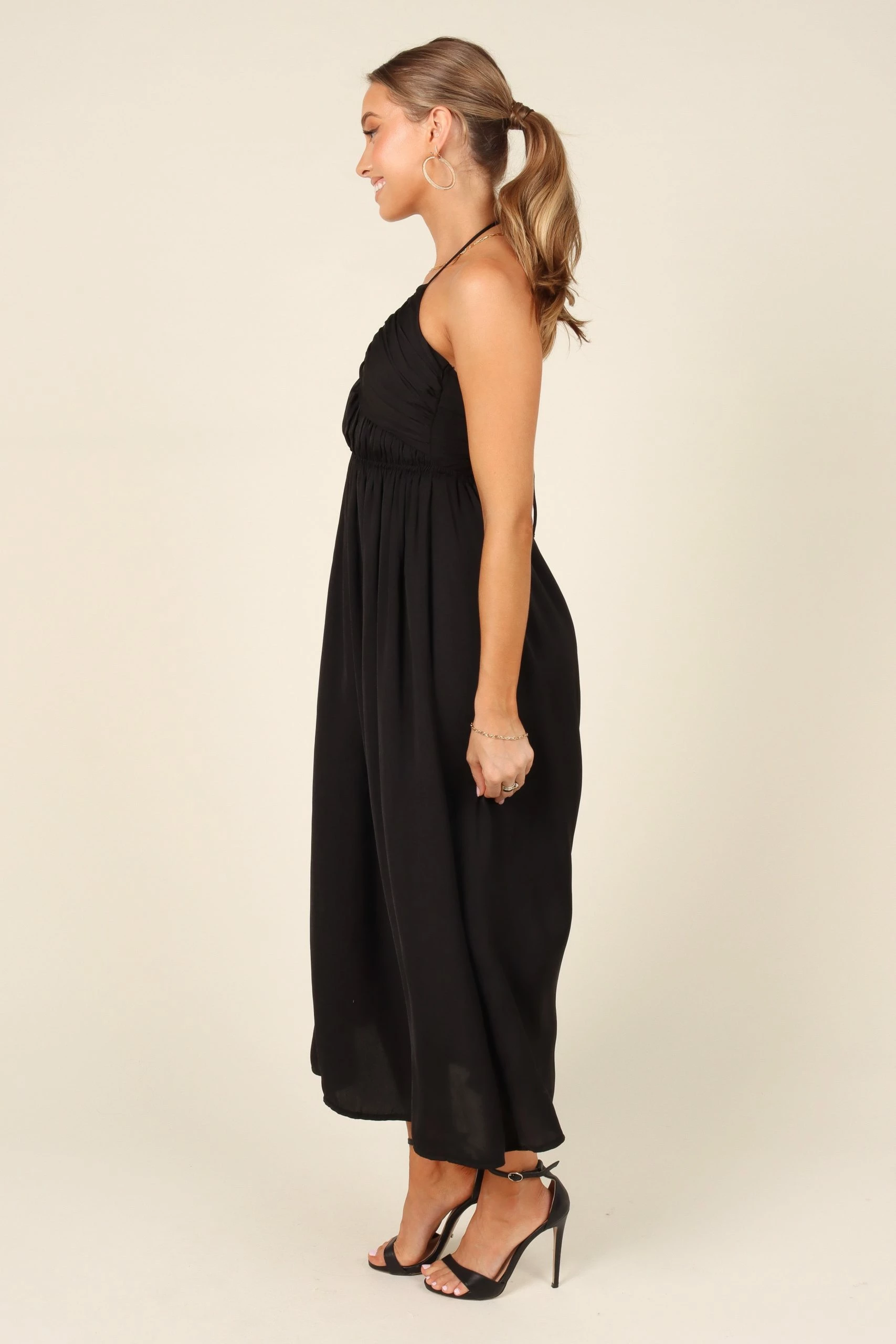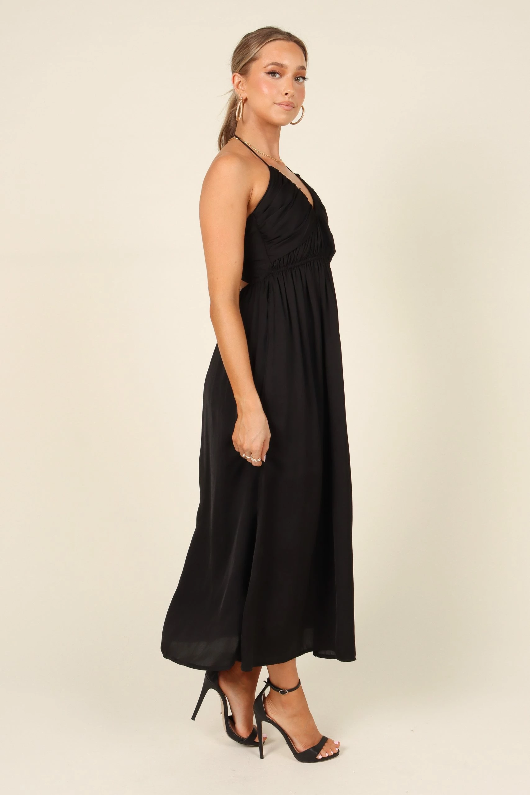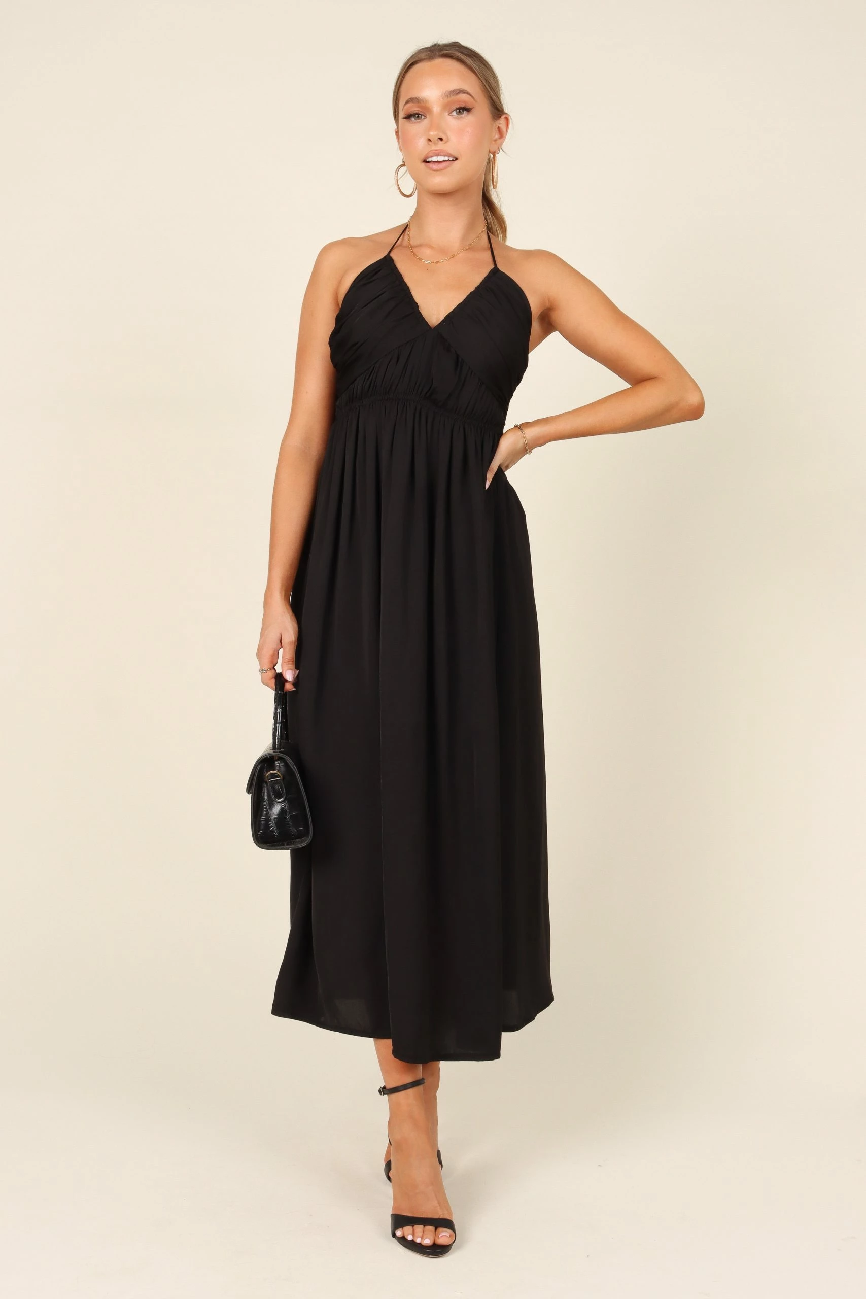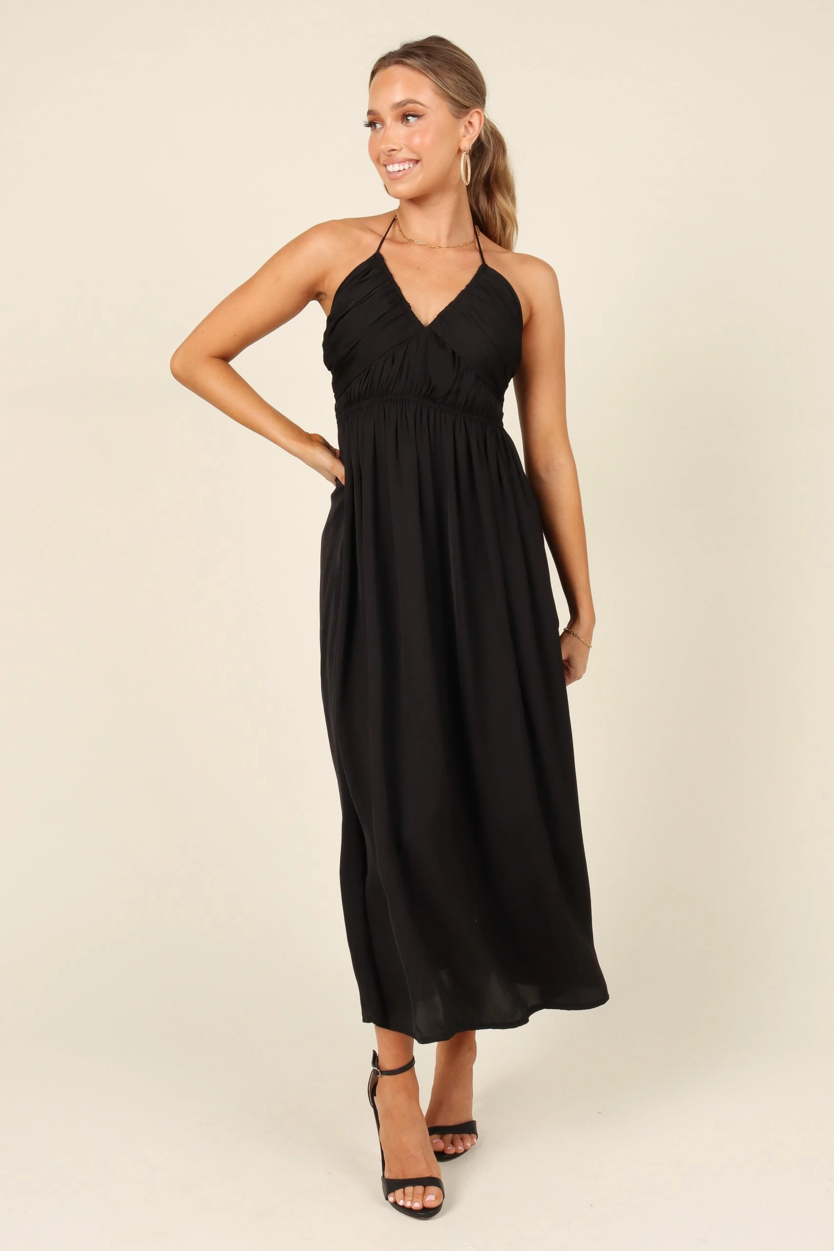 | DETAILS Make a statement in this show-stopping Maxi Dress! Featuring an elegant halter neckline with tie close and ruched bust detail, you’ll be sure to turn heads. The back tie close feature gives you the perfect fit while the drop A-Line skirt offers an ultra-flattering silhouette.