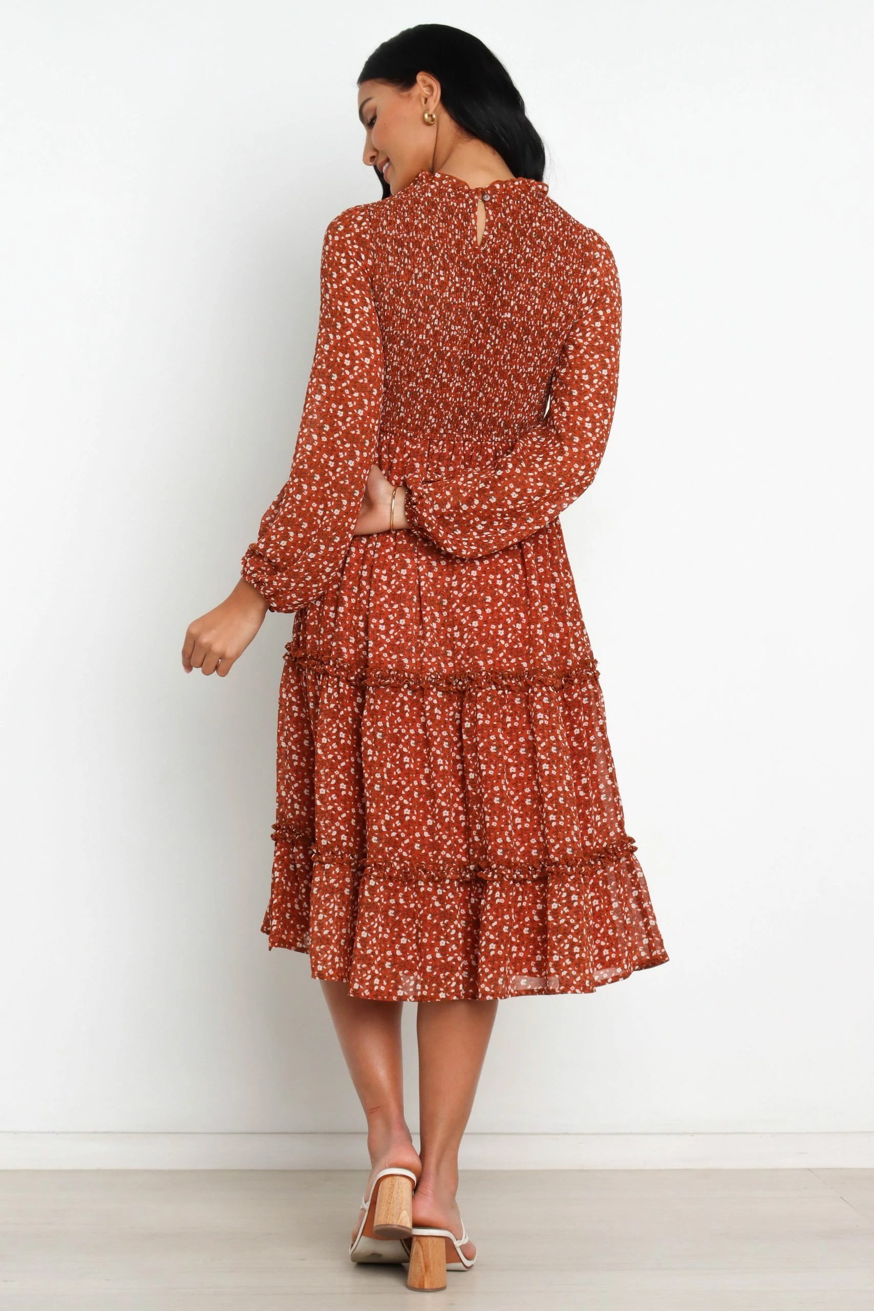 | DETAILS This midi dress is the perfect combination of fun, flirty and elegant! Featuring a round ruffle neckline and long sleeves with elasticised cuffs, it is sure to make you feel confident in any occasion.