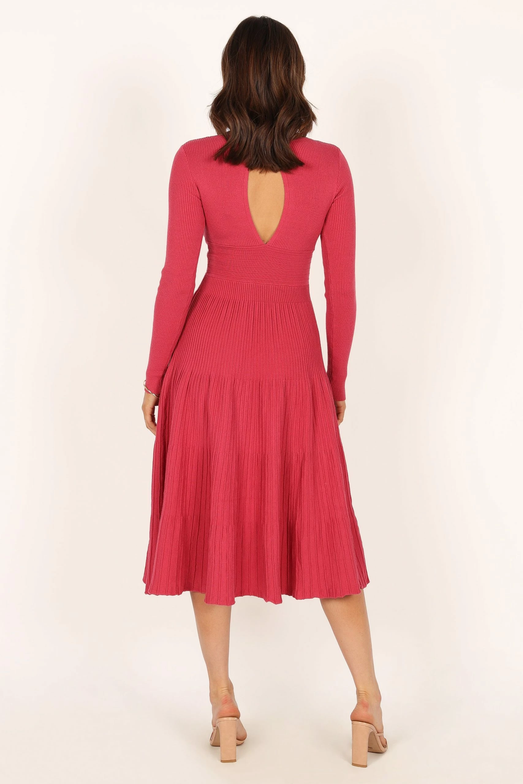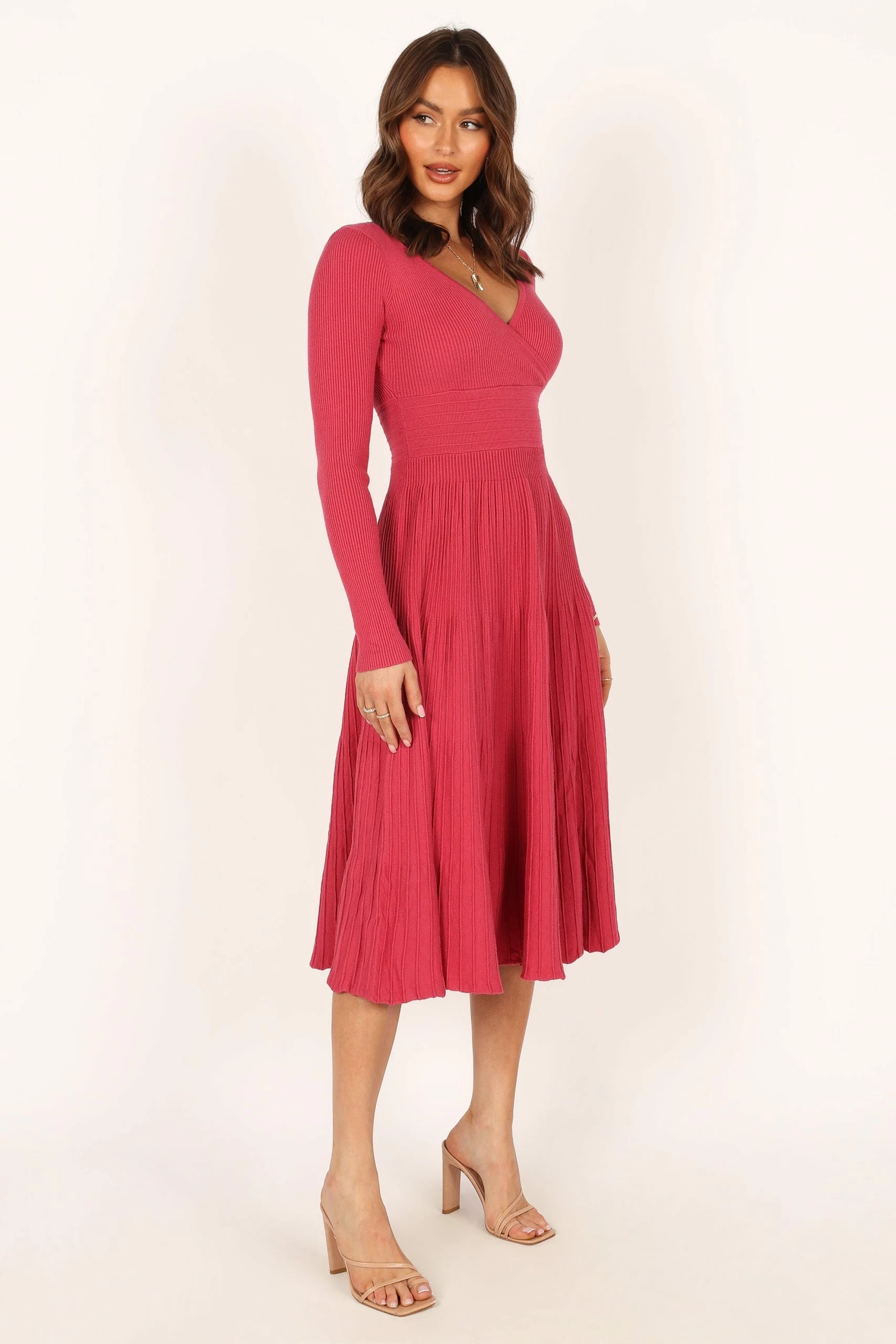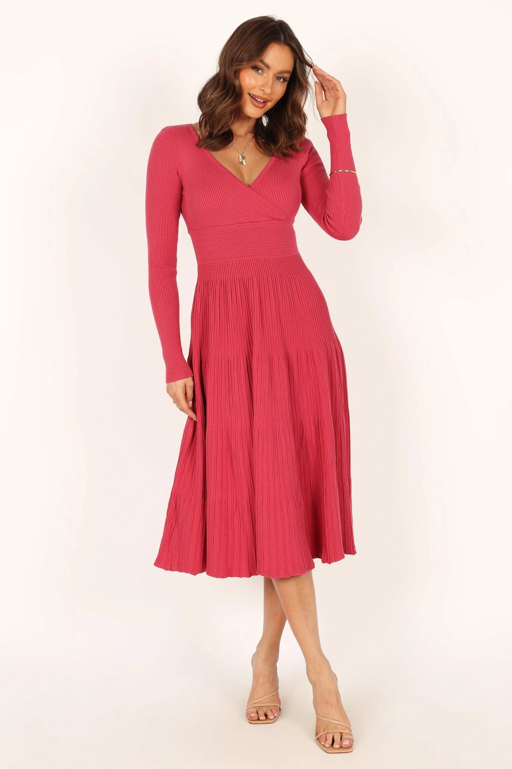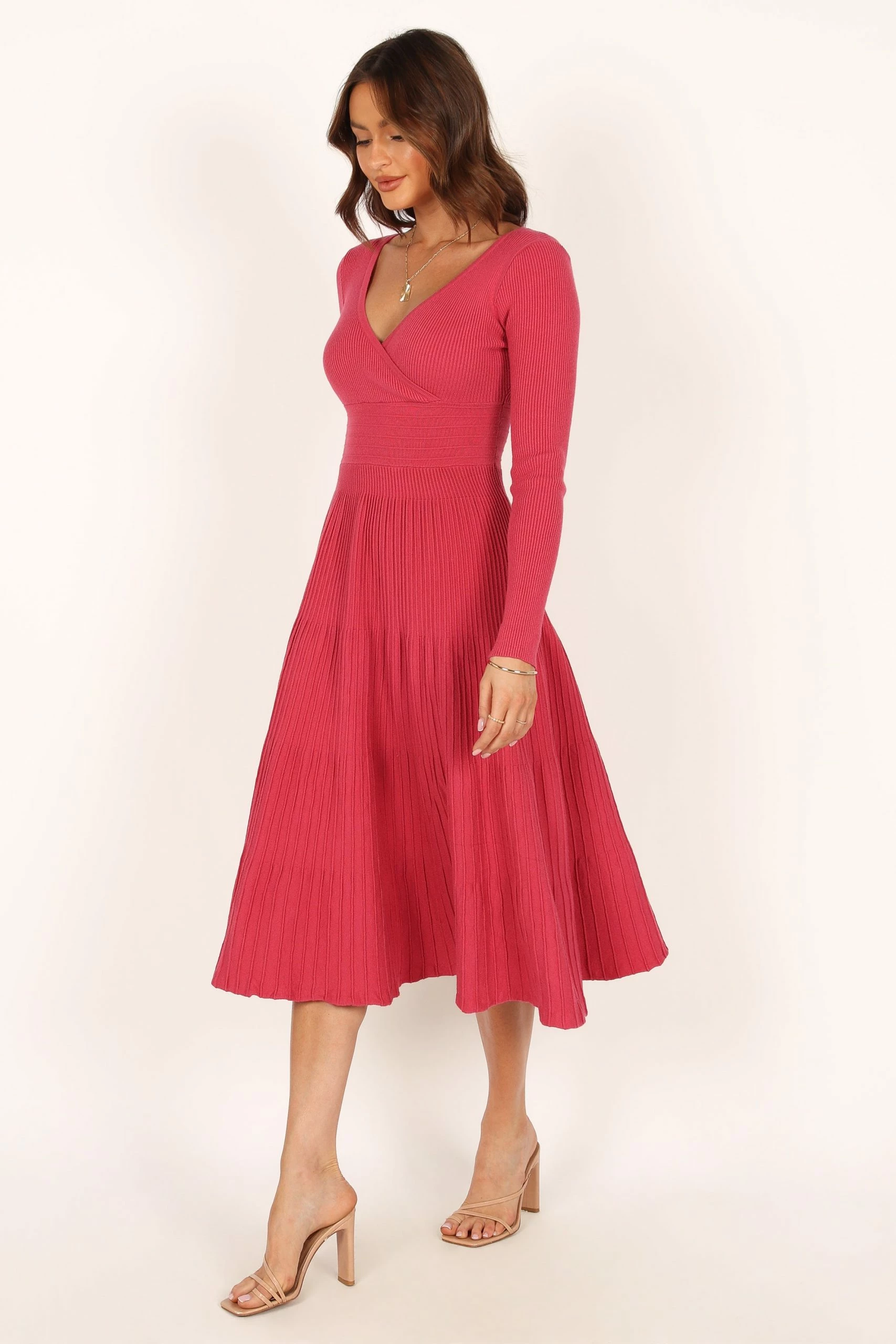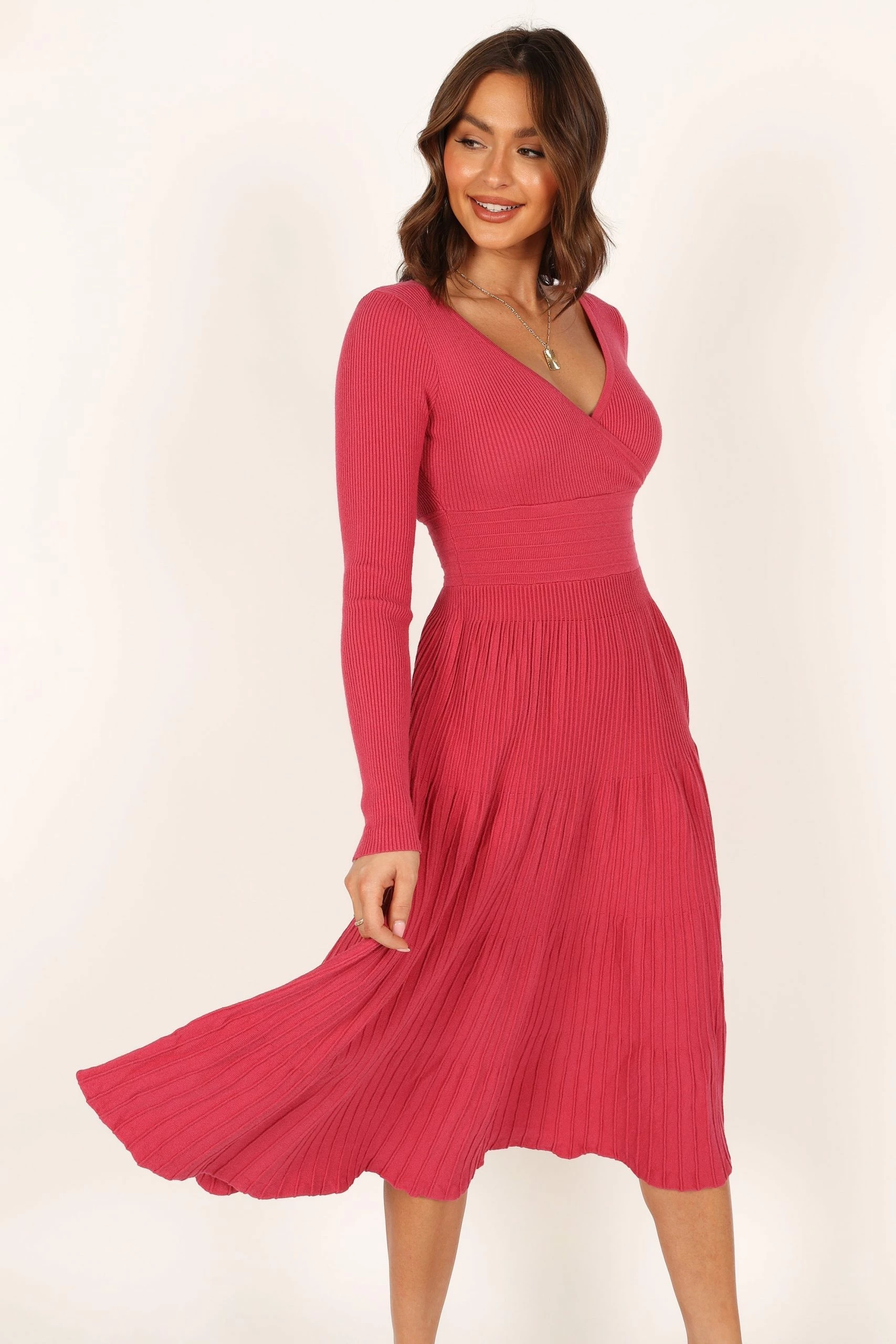 | DETAILS Achieve that effortlessly stylish look with this midi dress. The crossover neckline and back cutout provide a figure-flattering silhouette, while the ribbed fabric adds texture. Long sleeves make it perfect for cooler days, while the a line skirt adds movement.