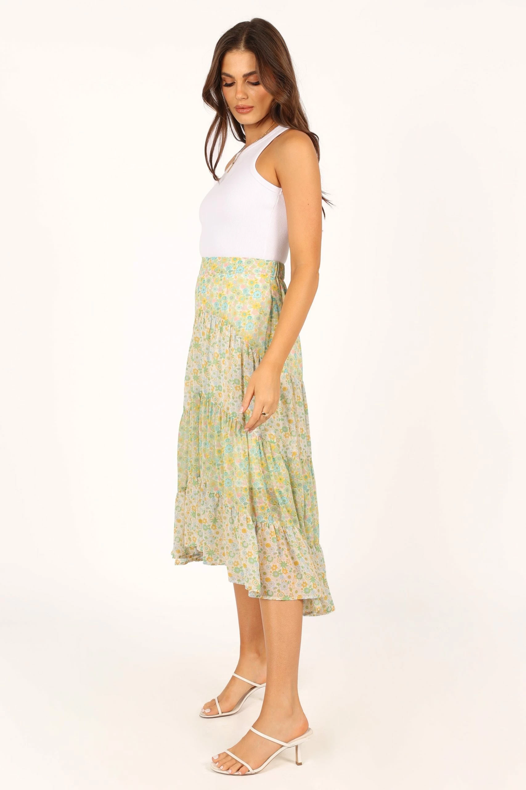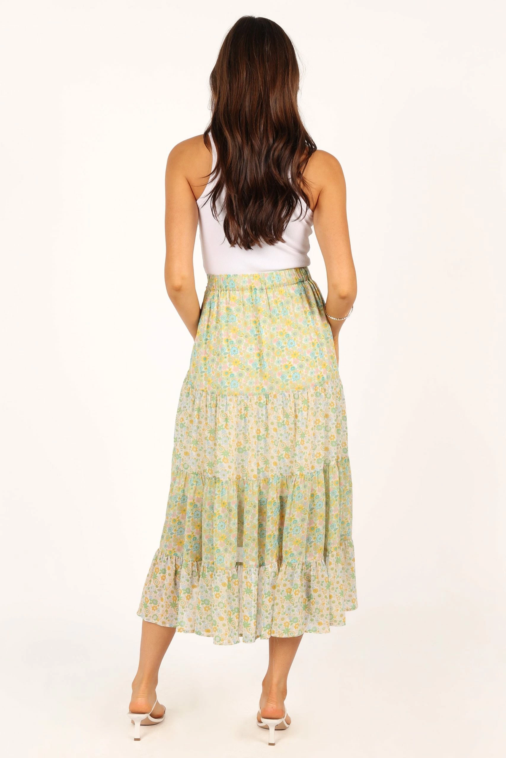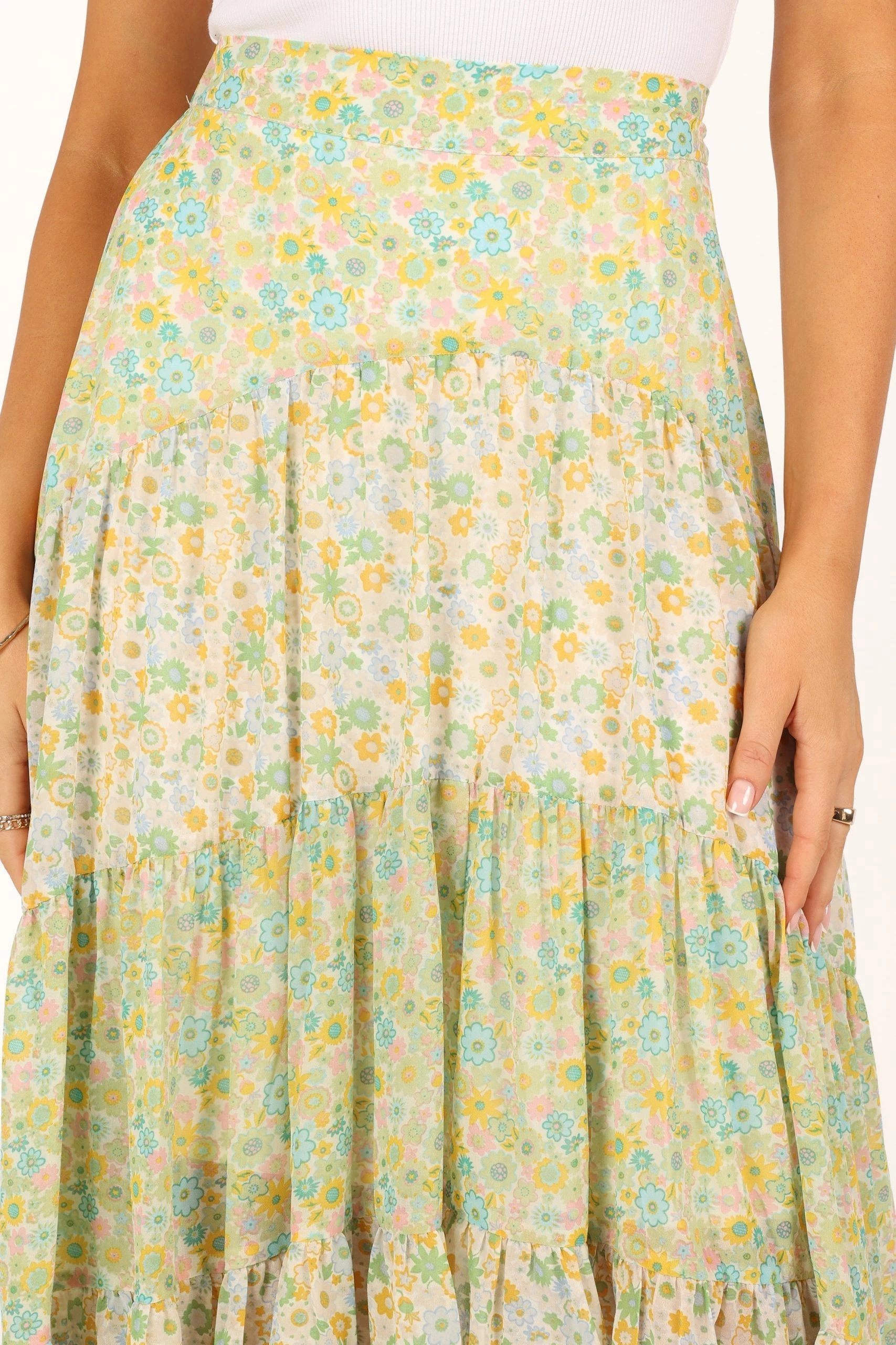 | DETAILS This beautiful midi length skirt is perfect for your wardrobe! Crafted with a high-waisted silhouette, it features an elastic waistband for ease and comfort. The eye-catching tiered skirt panels add movement and dimension to this stunning piece, all finished off with a pretty floral fabric design.