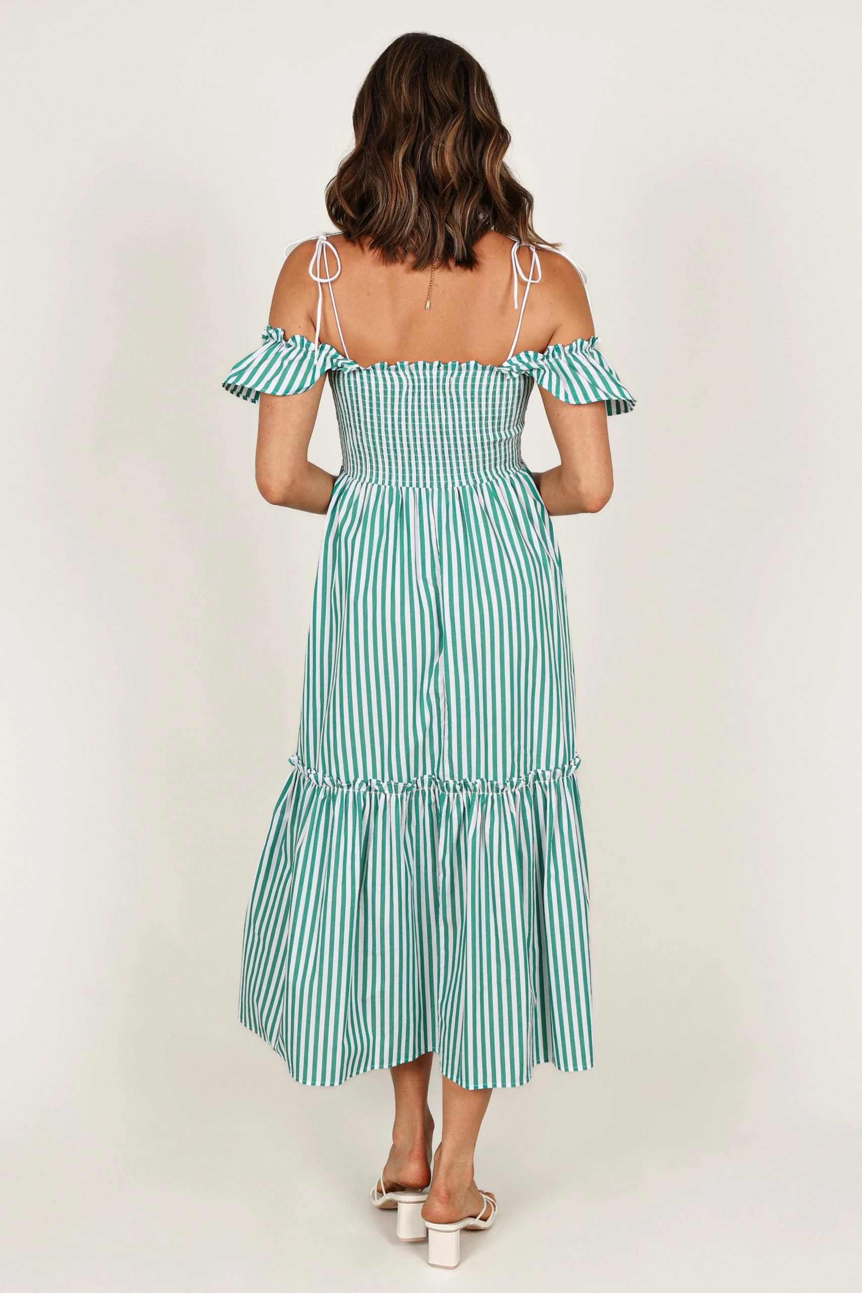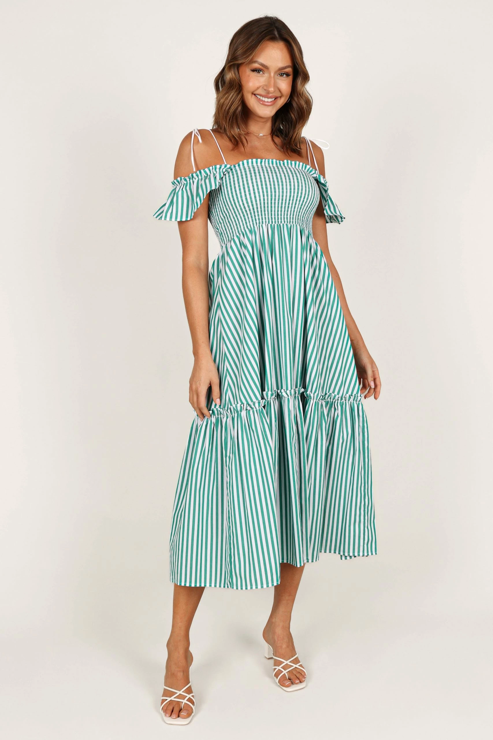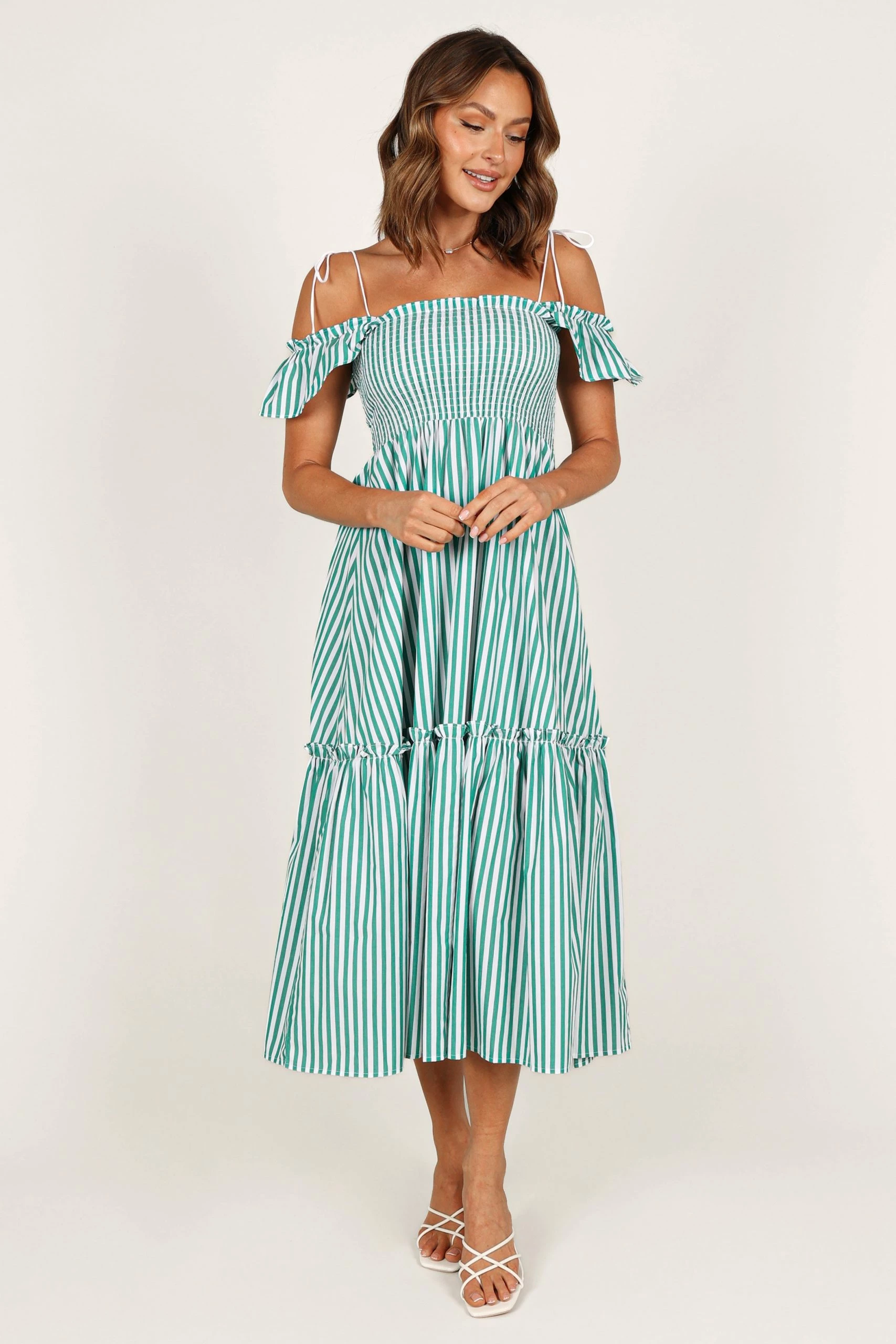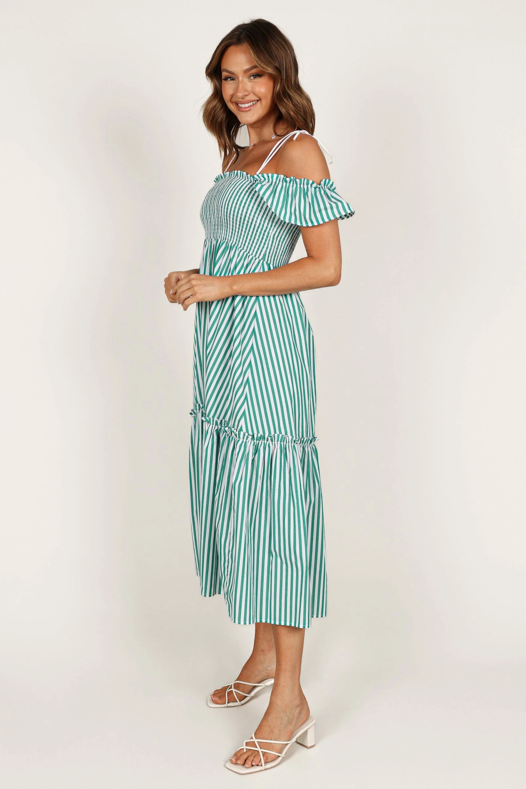 | DETAILS This maxi dress is the perfect go-to for any summertime event. The off shoulder style, adjustable thin ties and a shirred bodice provide a flirty and fun feel to the piece, while the maxi length offers an elegant touch.